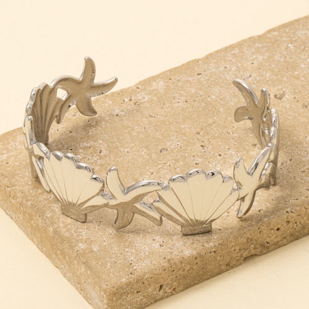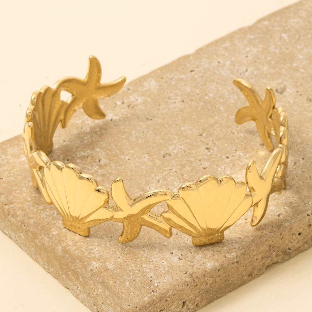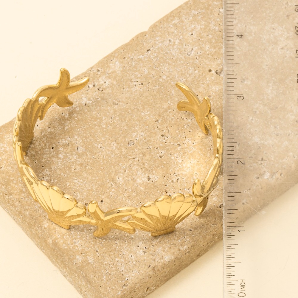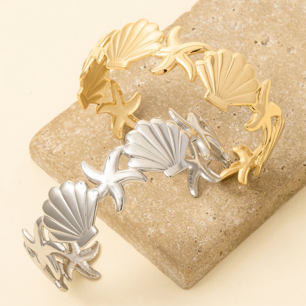 - Perfectly polished and endlessly versatile, this cuff bracelet includes a stunning stainless steel clam shells and starfish design. A versatile cuff bracelet that's perfect for any occasion, adding a touch of elegance and style to any outfit. Available in G, S. This item is sold in packs of 1.