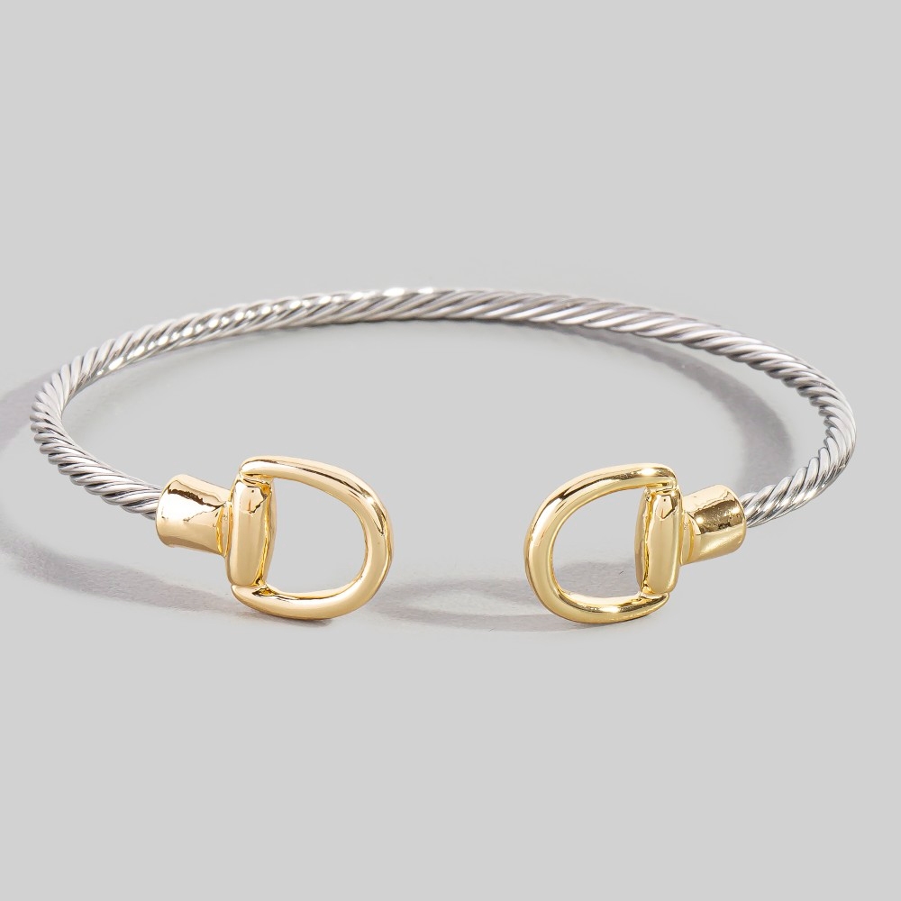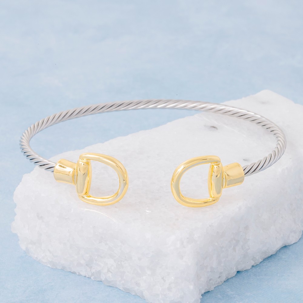 Add some edge to your wardrobe, this cuff bracelet adds a distinctive stainless steel two tone d link rope design. The perfect cuff bracelet for completing any outfit, whether you're dressing up or keeping it casual. Available in K. This item is sold in packs of 1.