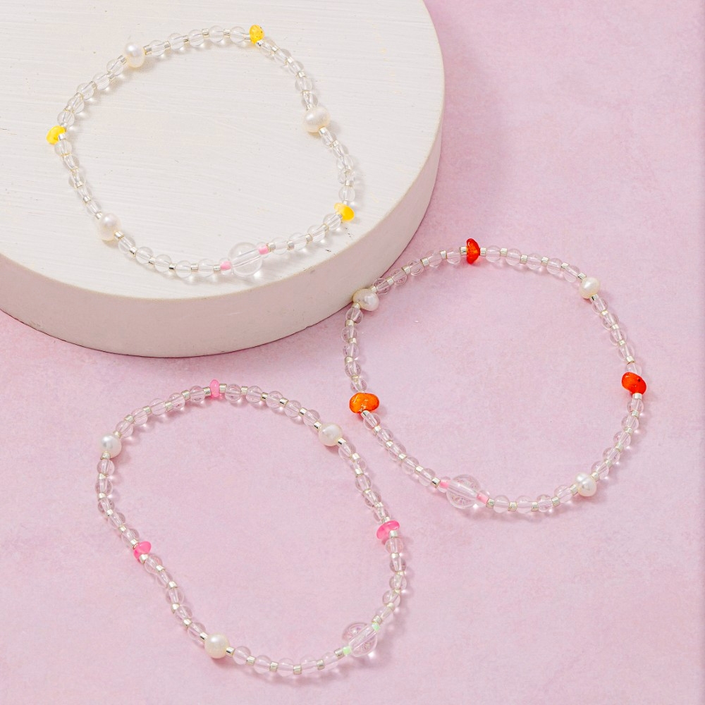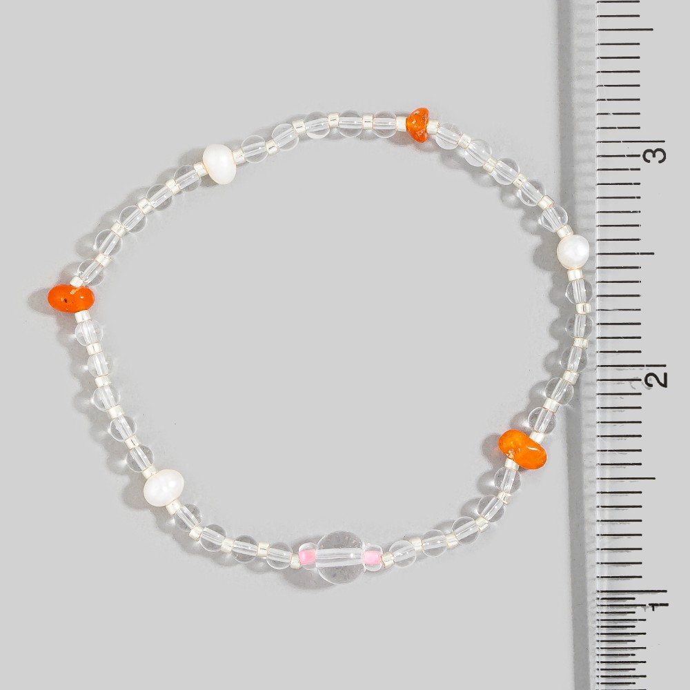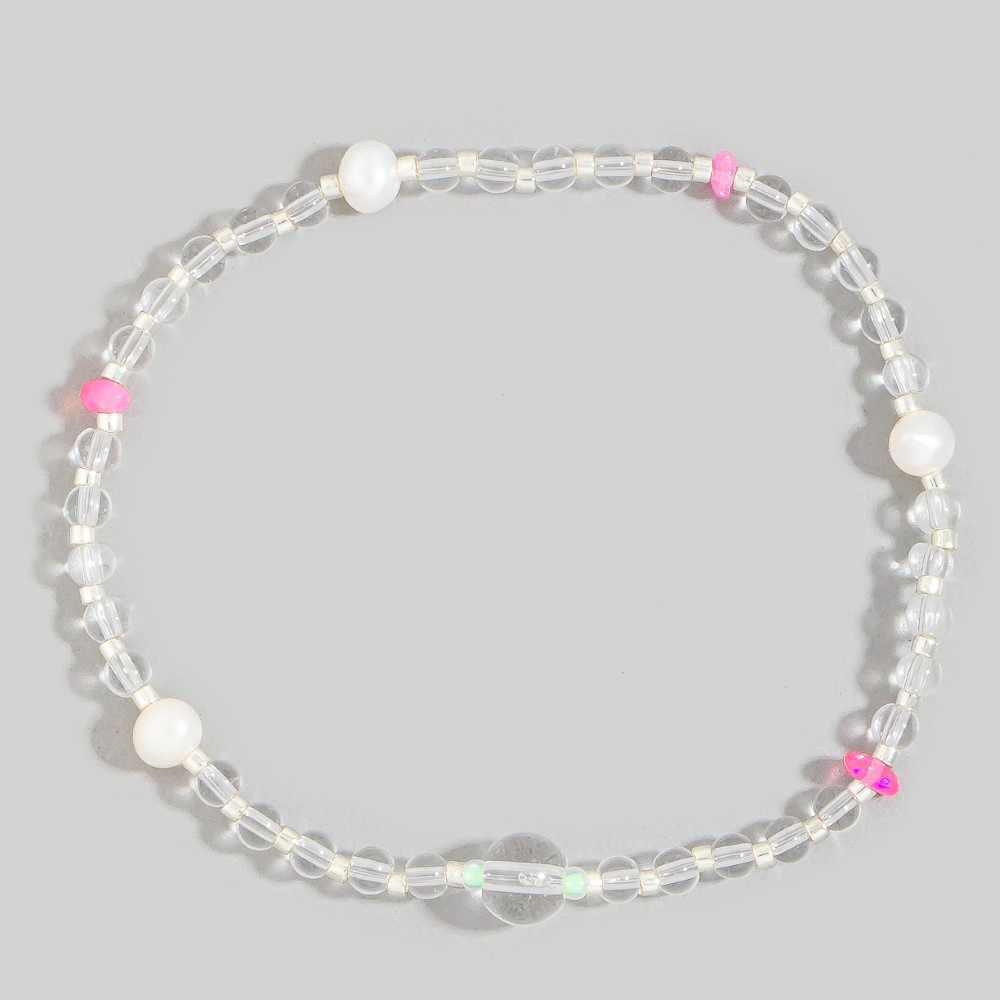 Elevate your style with something unique and daring, this bracelet evokes a captivating glass bead with pearls design. Transform your outfit into a fashion masterpiece with this versatile bracelet, an essential for the style-conscious individual. Available in GN, PE, PK. This item is sold in packs of 1.