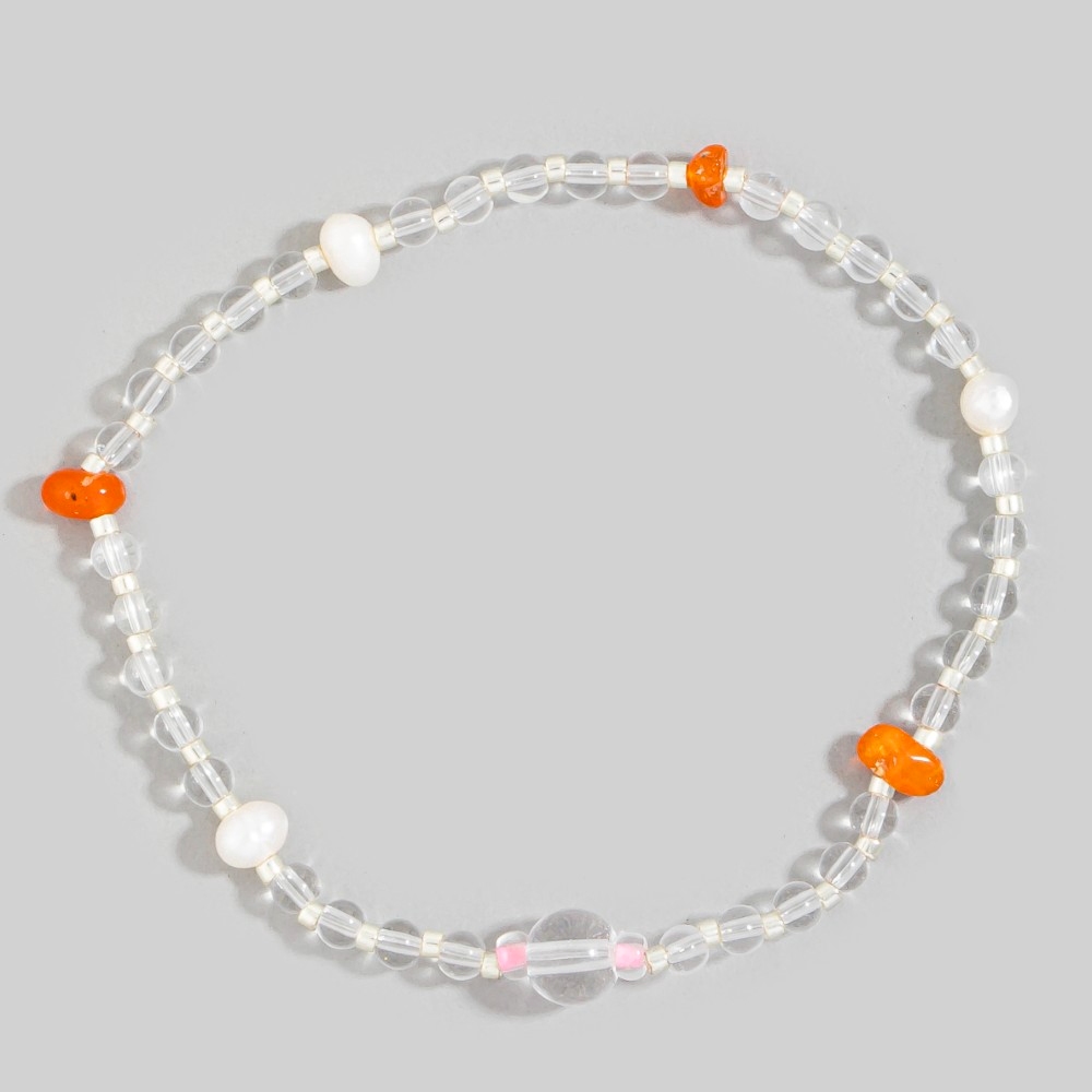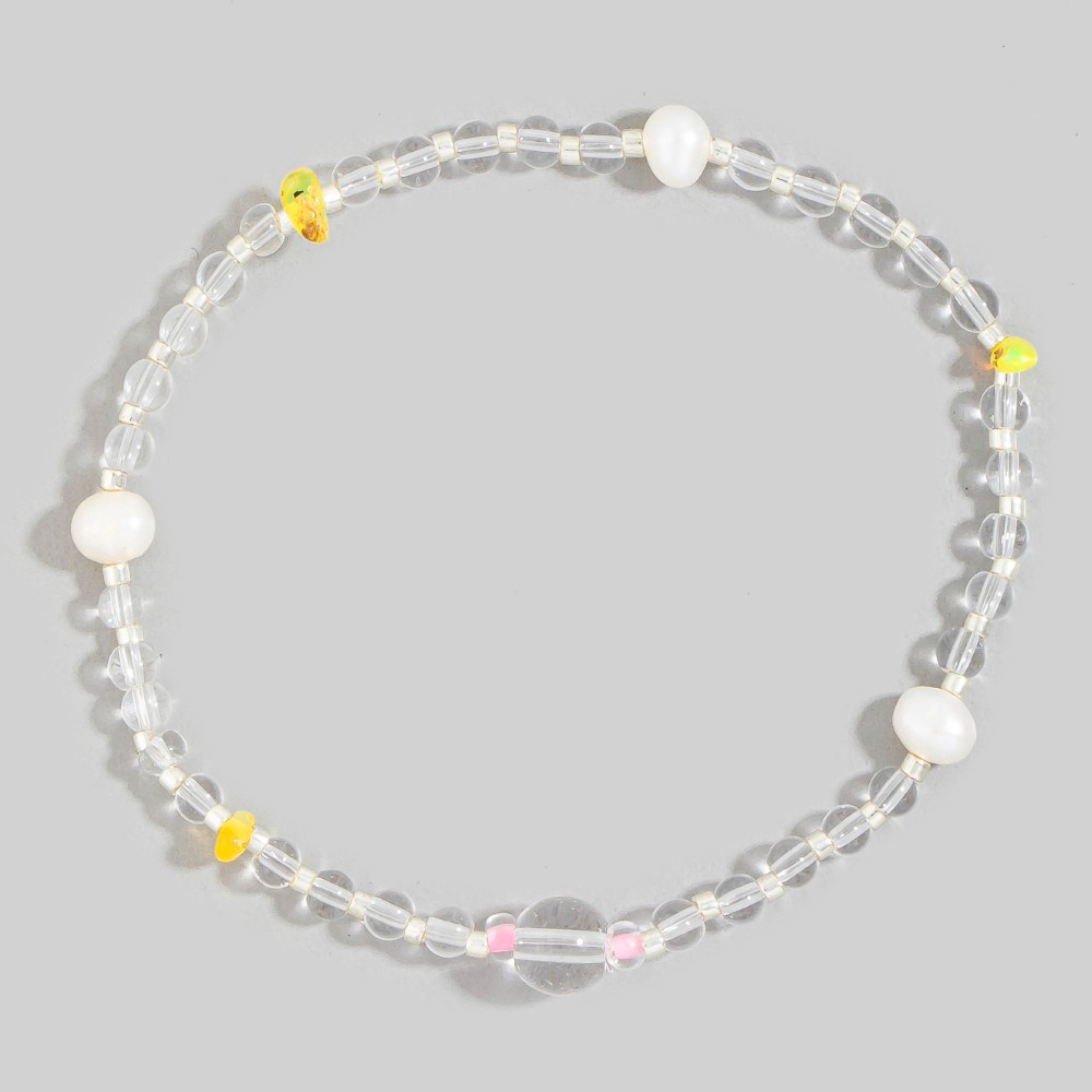 This bracelet is made with 60% Glass, 15% Opal and 15% Fresh Water Pearl.