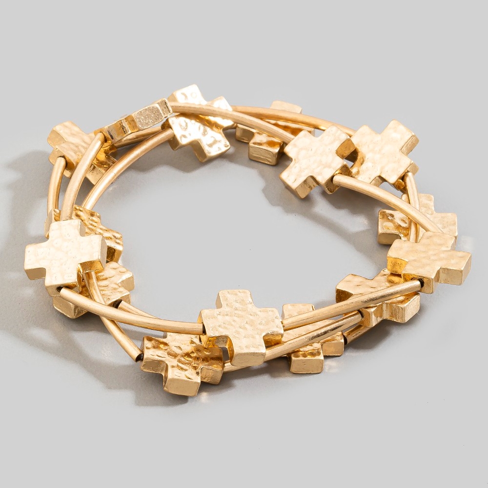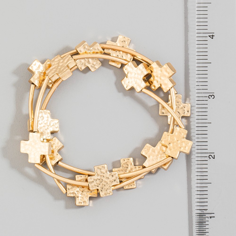 - Perfect for any fashion-forward individual, this bracelet incorporates a flawless hammered cross charms layered set design. A chic and sophisticated bracelet that's perfect for dressing up or down. Available in WG, WS. This item is sold in packs of 1.