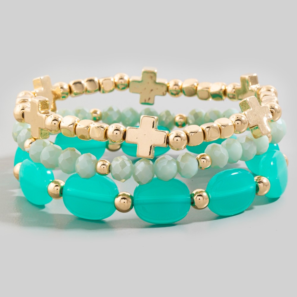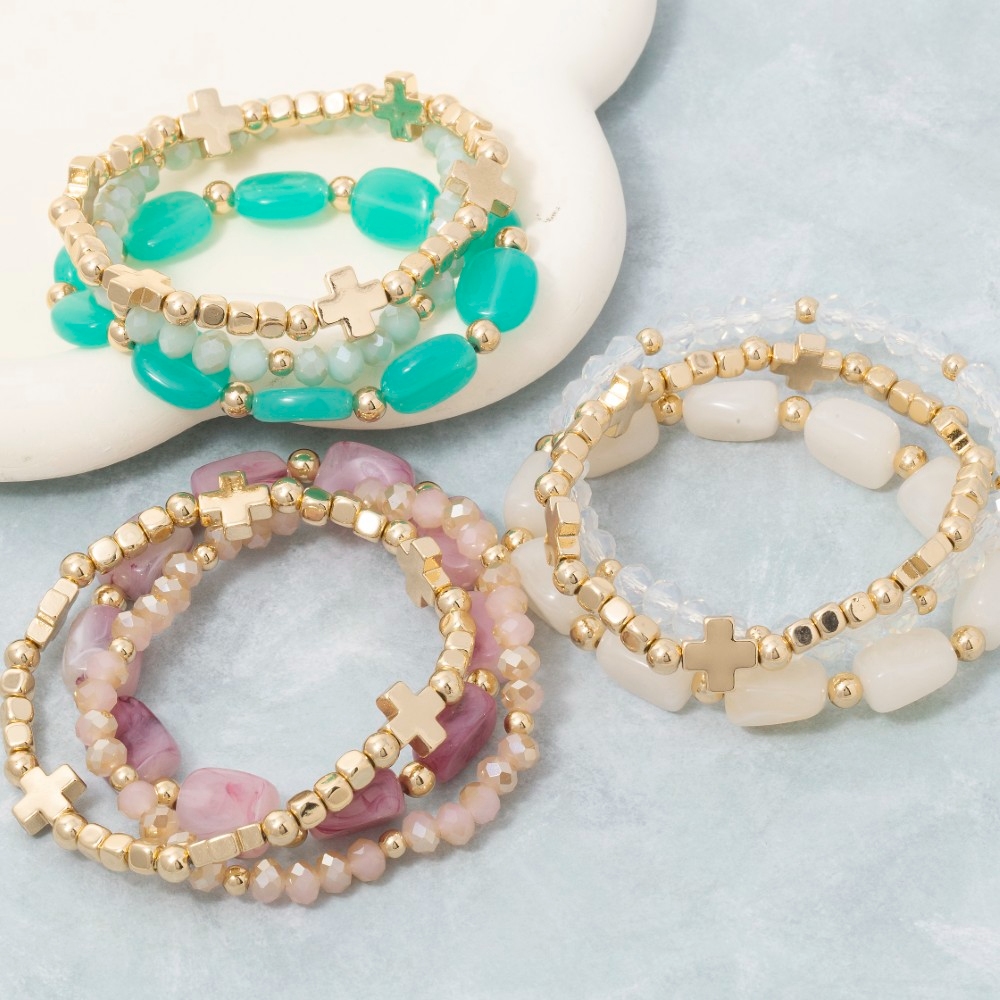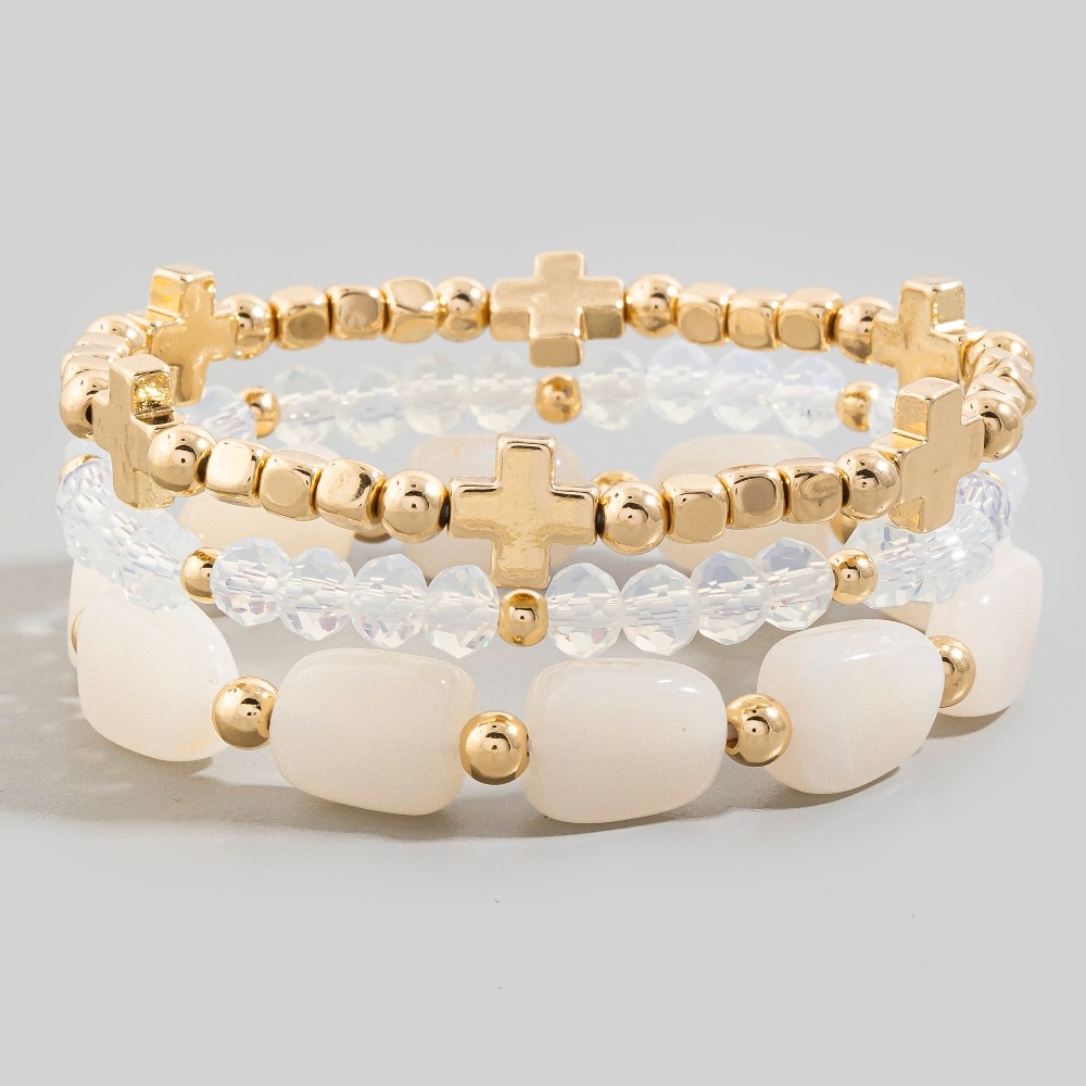 - This season's must-have bracelet, this bracelet reveals an intricate mixed glass and metallic beaded set design. This bracelet is ideal for both casual and formal events, adding a touch of sophistication to any outfit. Available in GDMIN, GDPINK, GDWHT. This item is sold in packs of 1.