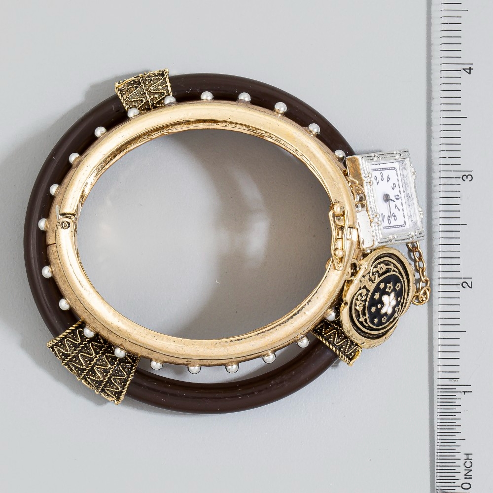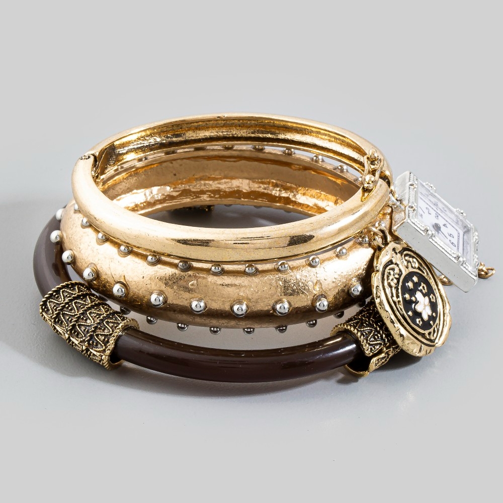 A bold and daring choice, perfect for those who want to stand out from the crowd, this bracelet comes with a special three piece bangle with charms and watch design. Experience the transformative power of this versatile bracelet, effortlessly enhancing the overall aesthetic of your outfit. This item is sold in packs of 1.