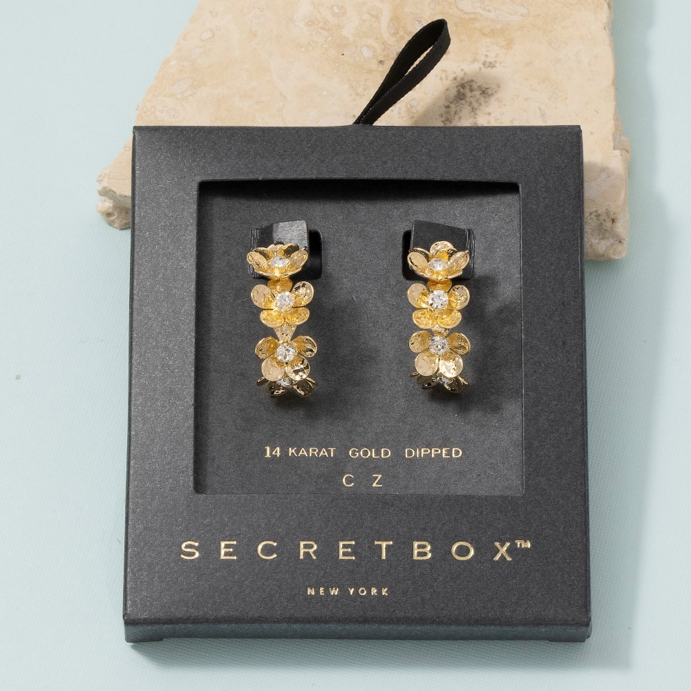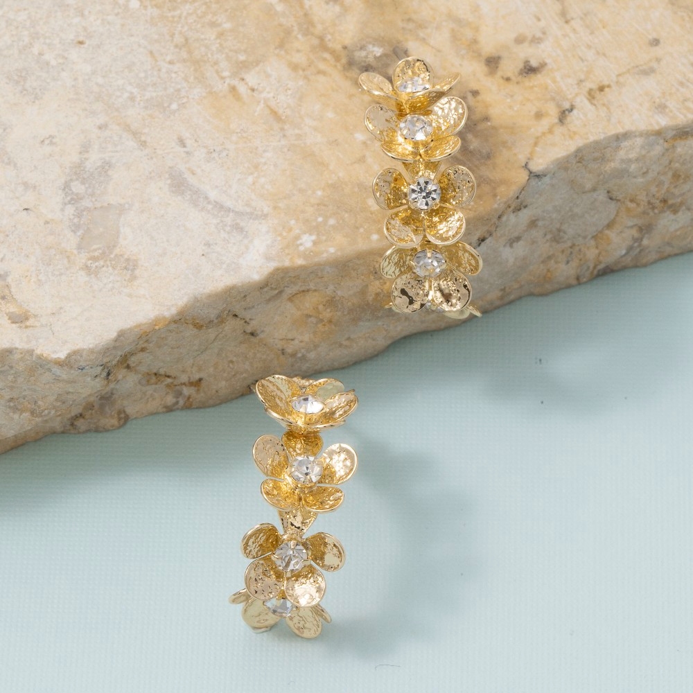 • This piece is both timeless and contemporary, this pair of hoop earrings shows off a distinctive 14k gold dipped cubic zirconia flower cluster design. Unleash the charm of this versatile pair of hoop earrings, effortlessly turning any outfit into a fashion statement. Available in GD. This item is sold in packs of 1.
