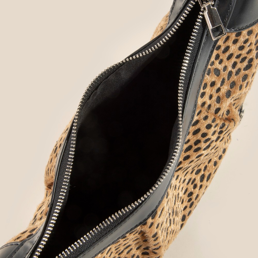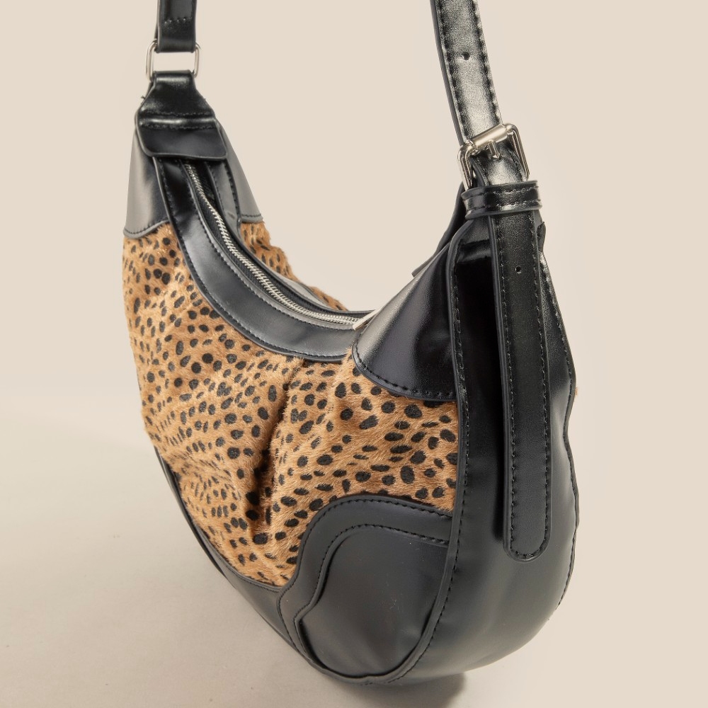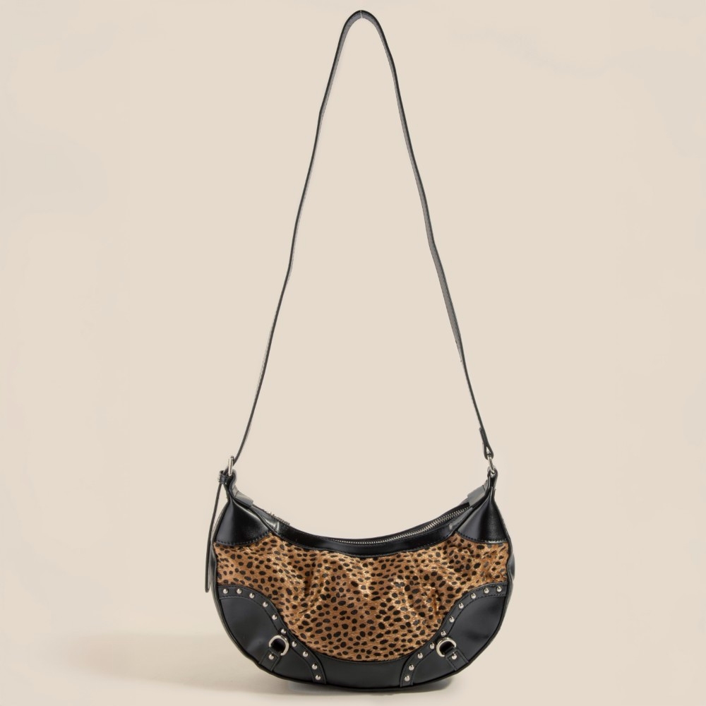 Guaranteed to add a touch of glamour to any outfit, this shoulder bag includes a stunning dark spotted leopard print half moon design. Discover the magic of accessorizing with this versatile shoulder bag, effortlessly upgrading the style quotient of any outfit. Available in LE. This item is sold in packs of 1.
