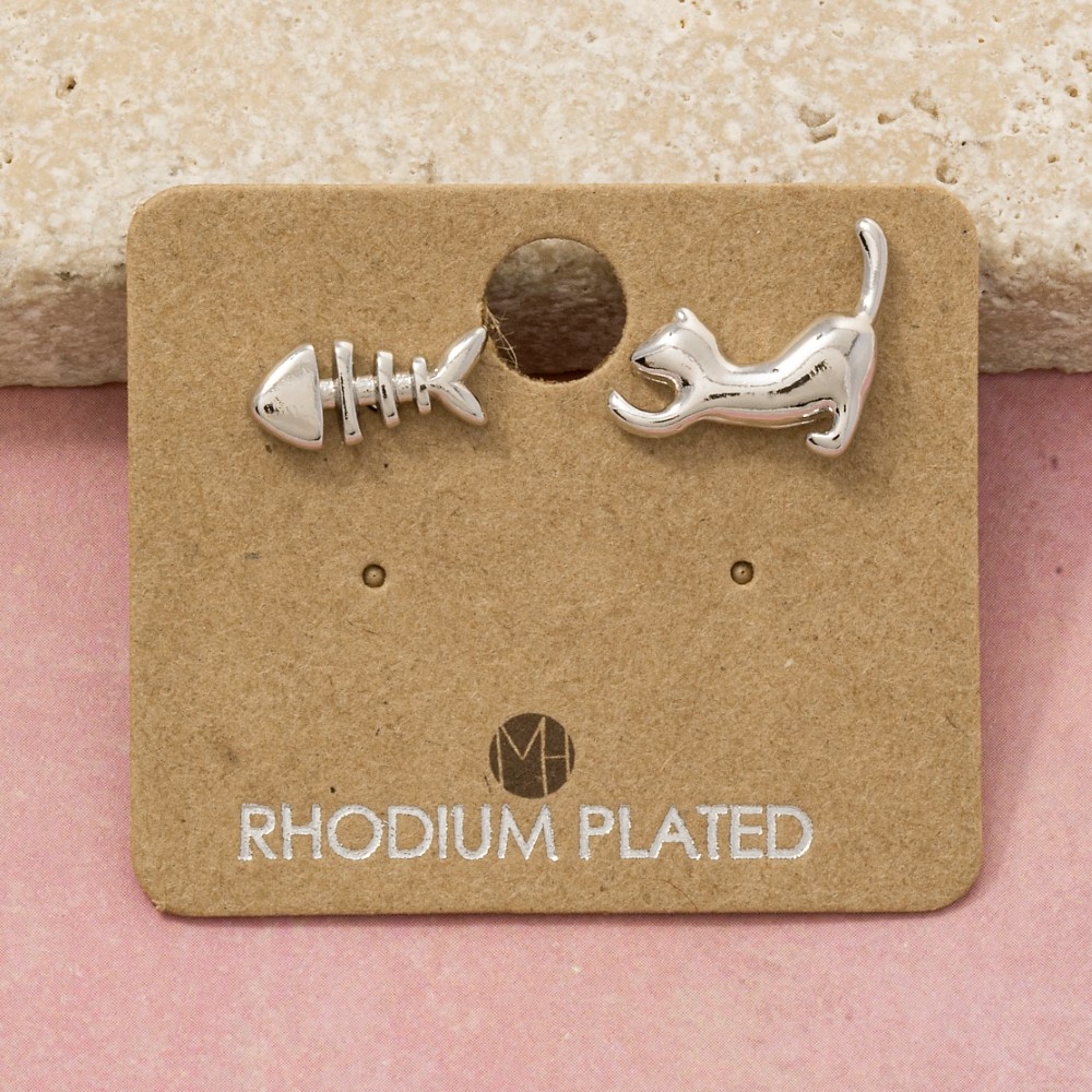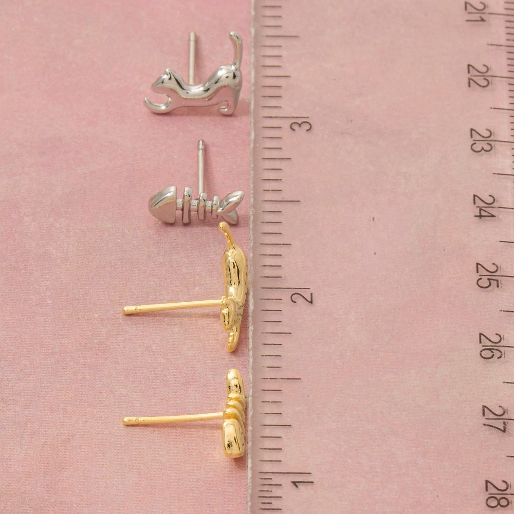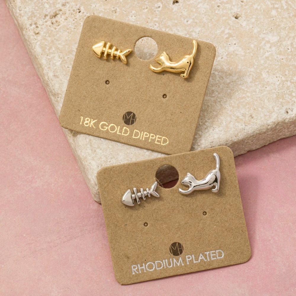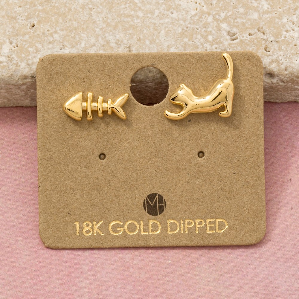 - Perfect for any occasion, from casual to formal, this pair of stud earrings comes with a special gold dipped cat and fish design. Perfect for adding a touch of glamour and sophistication to any outfit, this pair of stud earrings is a must-have. Available in G, S. This item is sold in packs of 1.