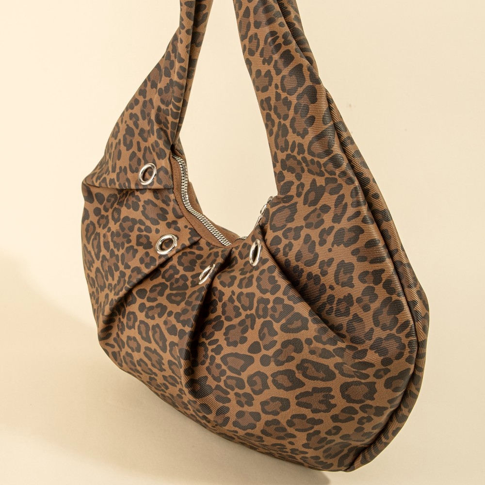 Effortlessly chic and always on-trend, this shoulder bag incorporates a remarkable leopard print grommet accent hobo design. Redefine your fashion identity with this versatile shoulder bag, a timeless piece that complements any wardrobe. This item is sold in packs of 12.