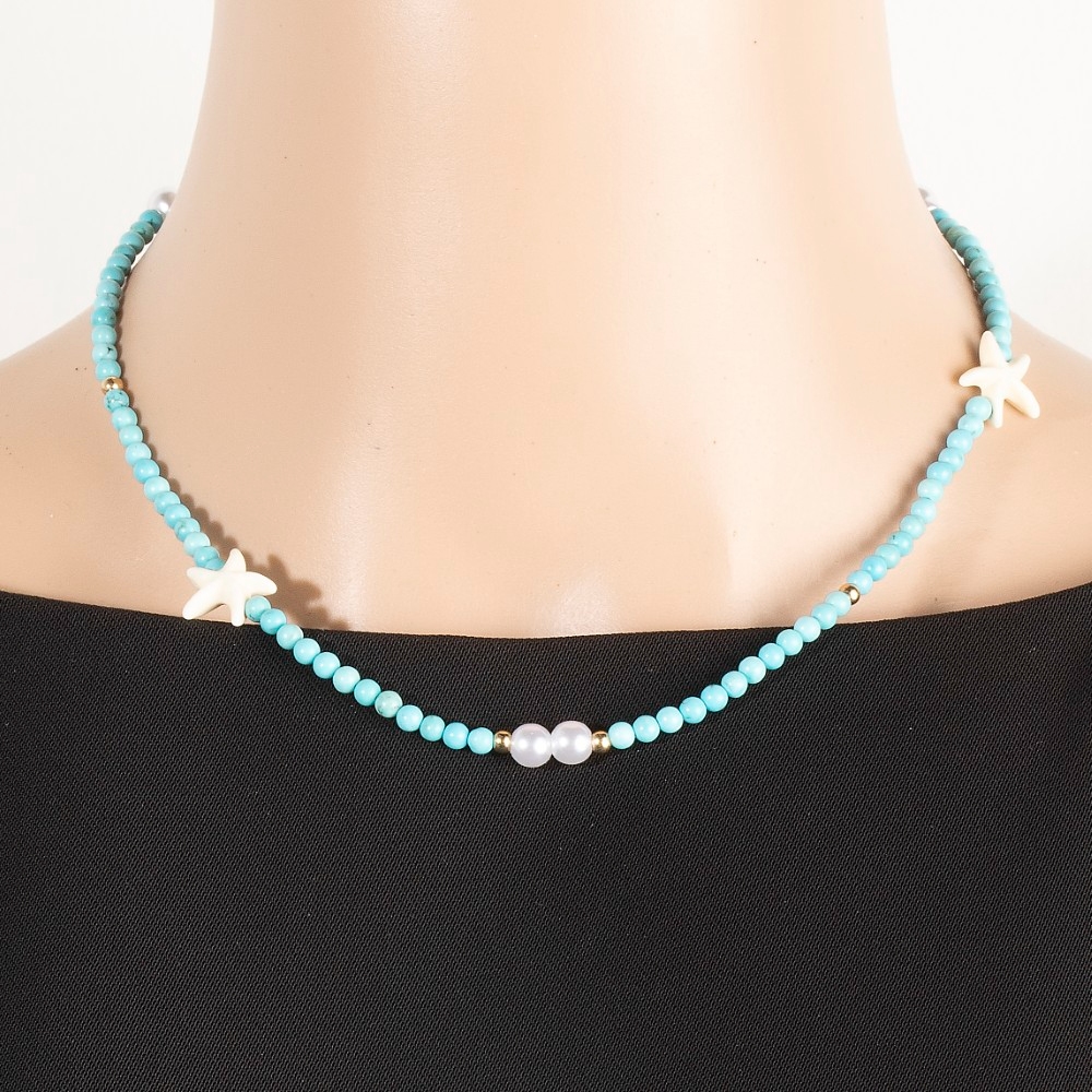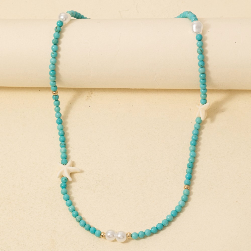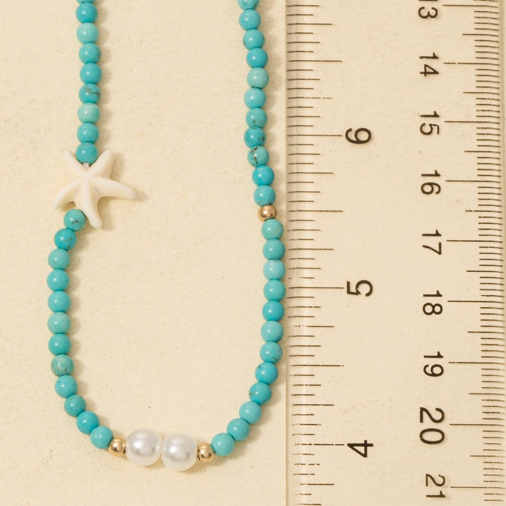 • A unique and stylish piece that sets you apart, this necklace offers a remarkable pearl and starfish turquoise beaded design. This necklace is ideal for both casual and formal events, adding a touch of sophistication to any outfit. Available in BL. This item is sold in packs of 1.