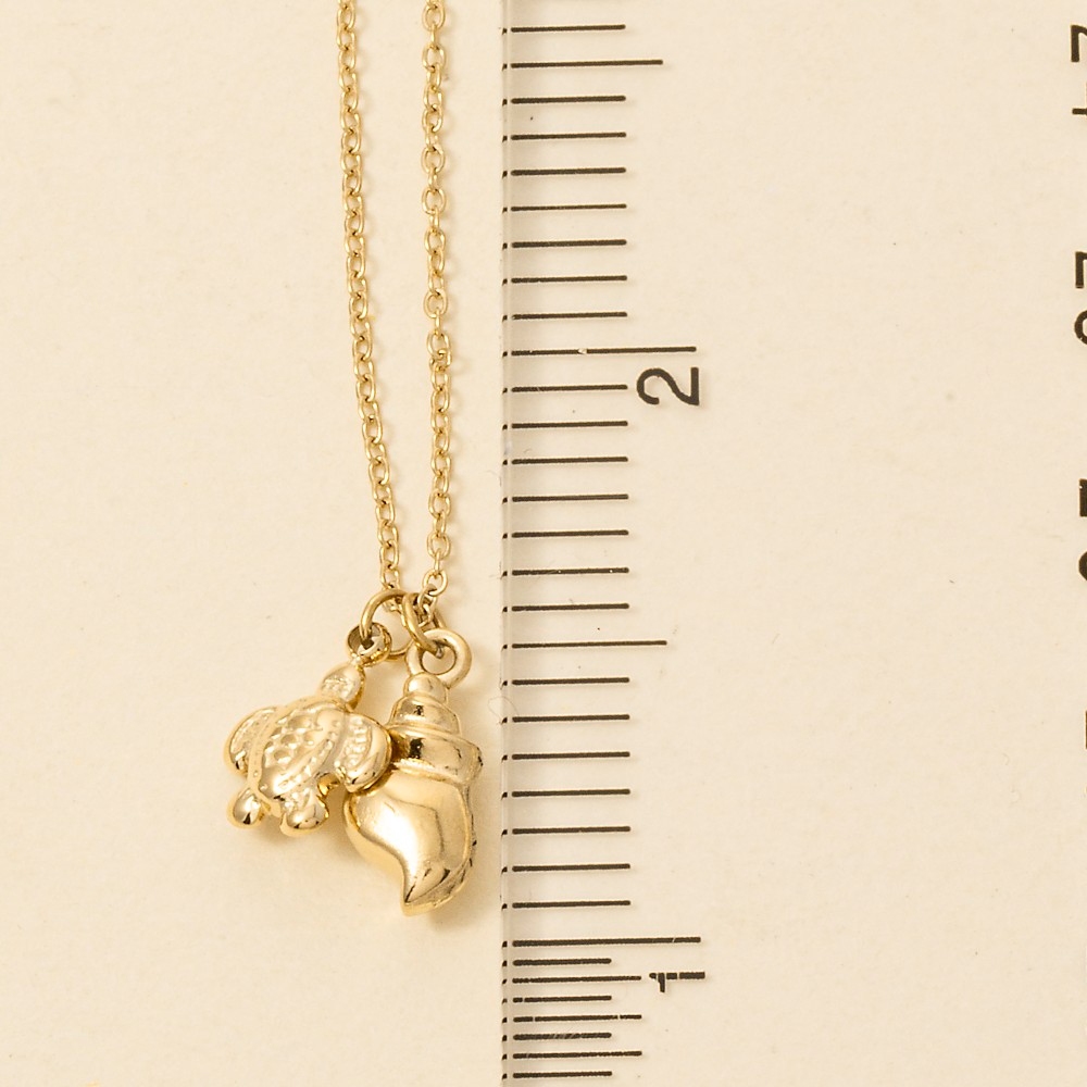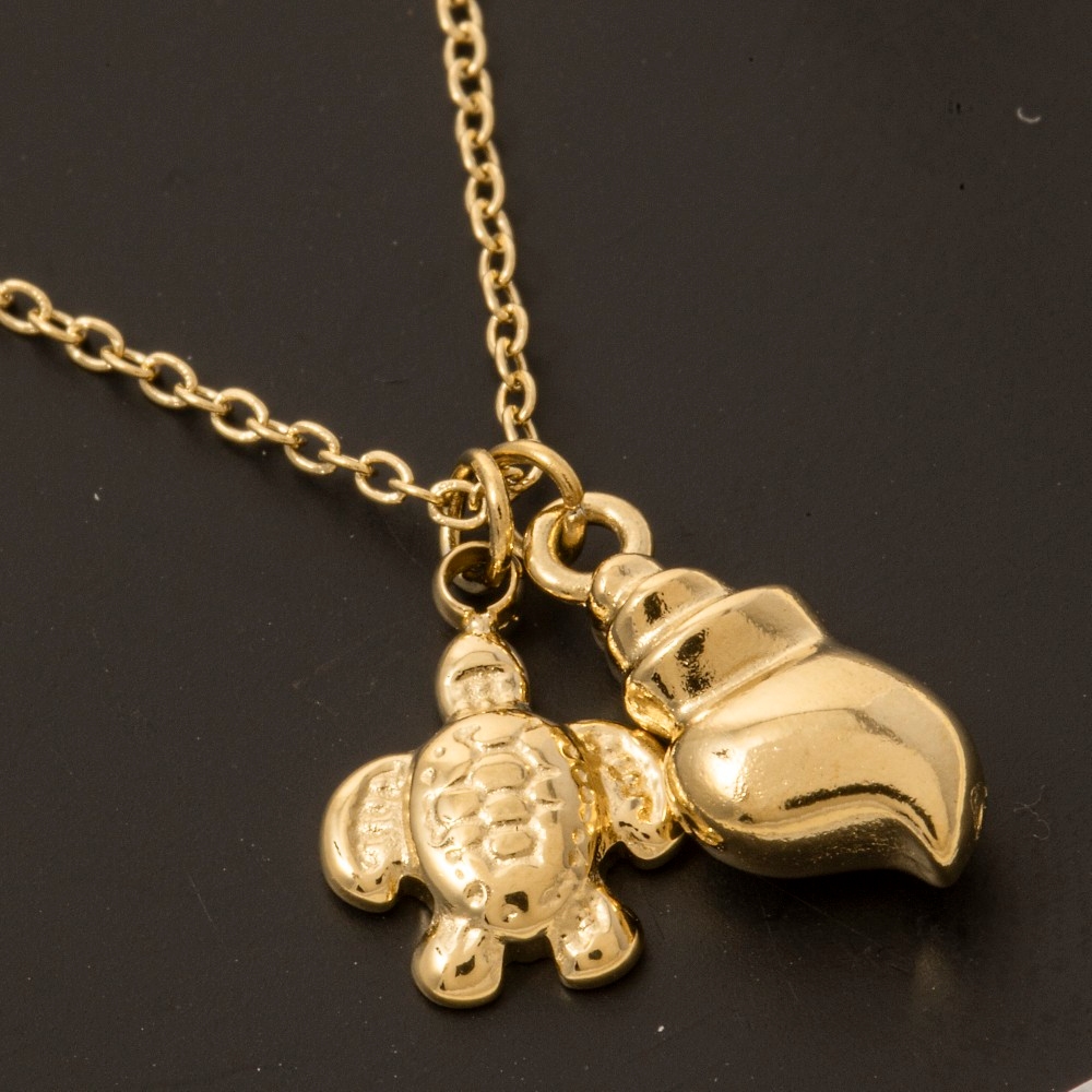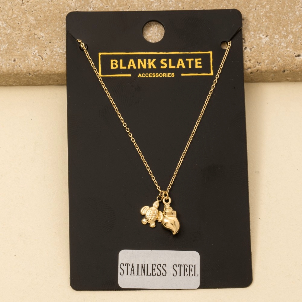 • This piece is a true showstopper, this necklace exudes a refined stainless steel sea shell and turtle pendant design. Embrace fashion flexibility with this versatile necklace, designed to effortlessly enhance the sophistication of any outfit. Available in G. This item is sold in packs of 1.