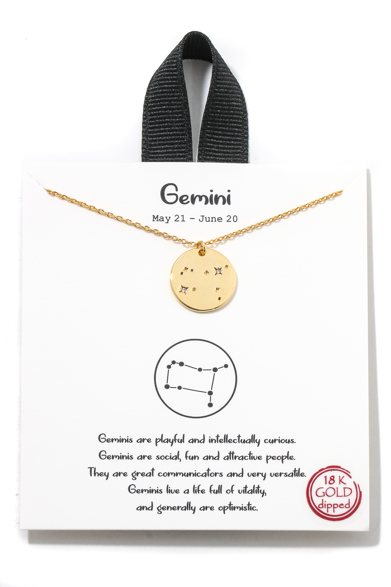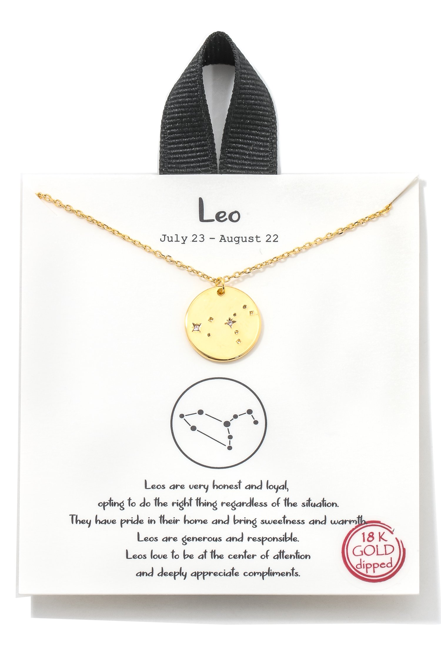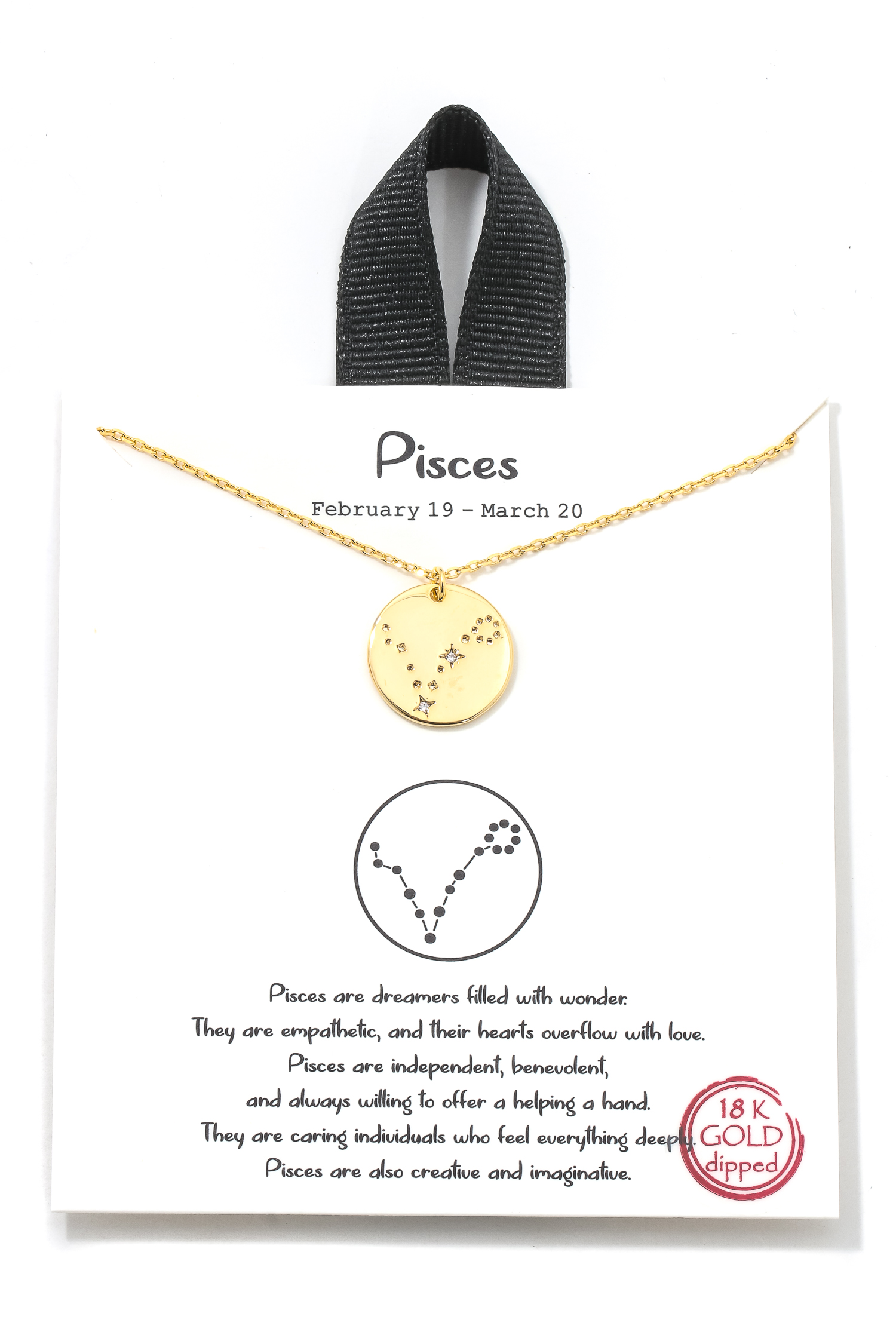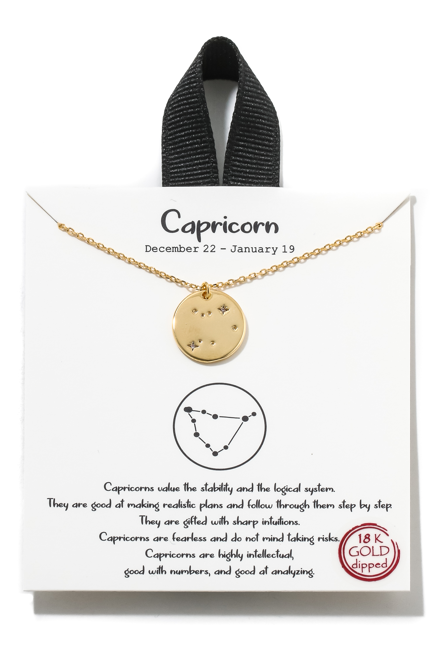 • A perfect in season must have necklace is made with detailed gold dip zodiac disc charm necklace design. Zodiac Constellation Perfect for this fall season! Available in Aqg,Aqs,Arg,Ars,Cng,Cns,Cpg,Cps,Geg,Ges,Leg,Les,Lig,Lis,Pig,Pis,Sag,Sas,Tag,Tas,Vig and Vis.