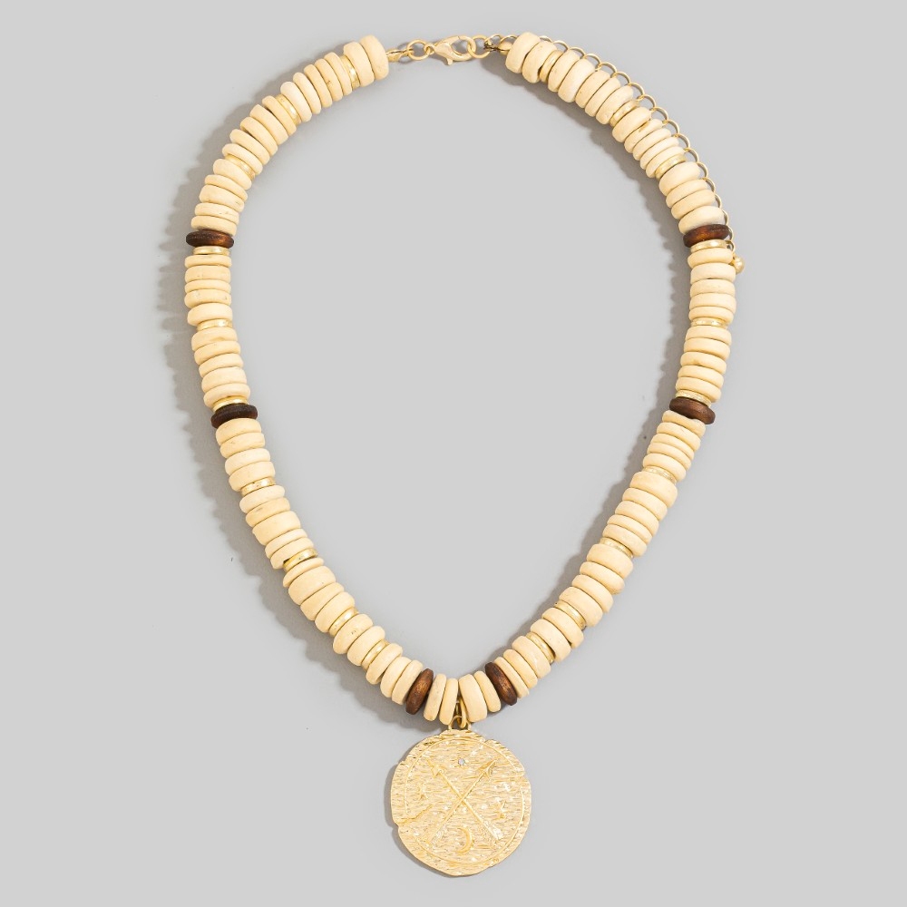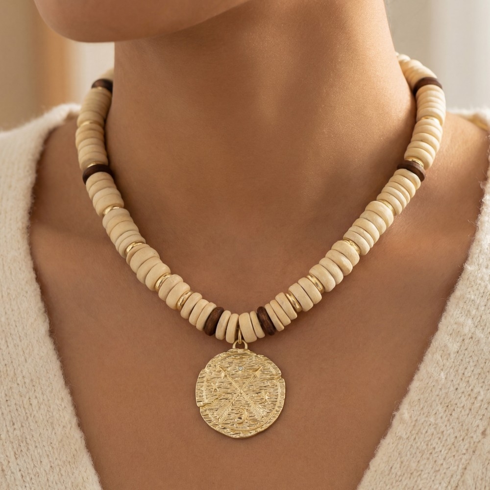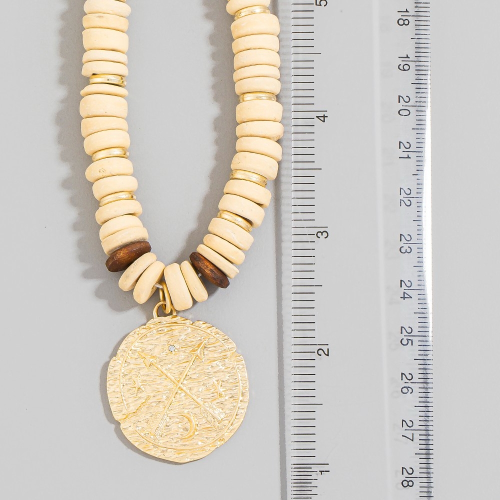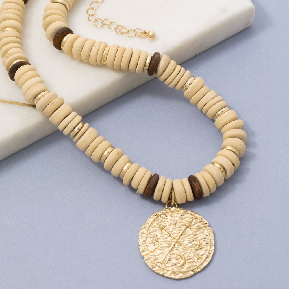 - Add a touch of luxury to any outfit, this pendant necklace features an exceptional arrow coin pendant wooden beaded necklace design. Perfect for adding some texture and dimension to any outfit, this pendant necklace is a must-have. Available in WGIV. This item is sold in packs of 1.