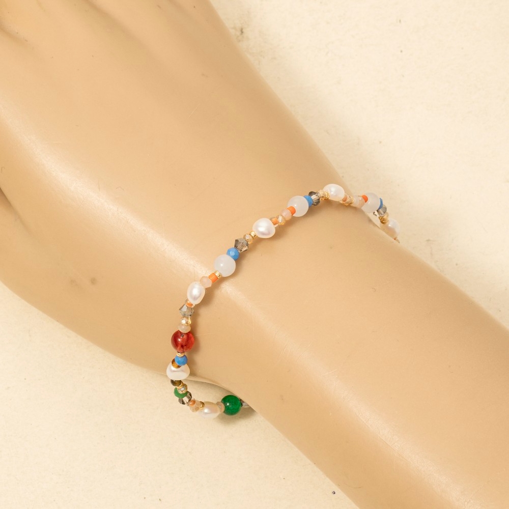 • This bracelet is made with 5% Brass, 30% Gemstone, 30% Glass and 35% Acrylic Pearl.