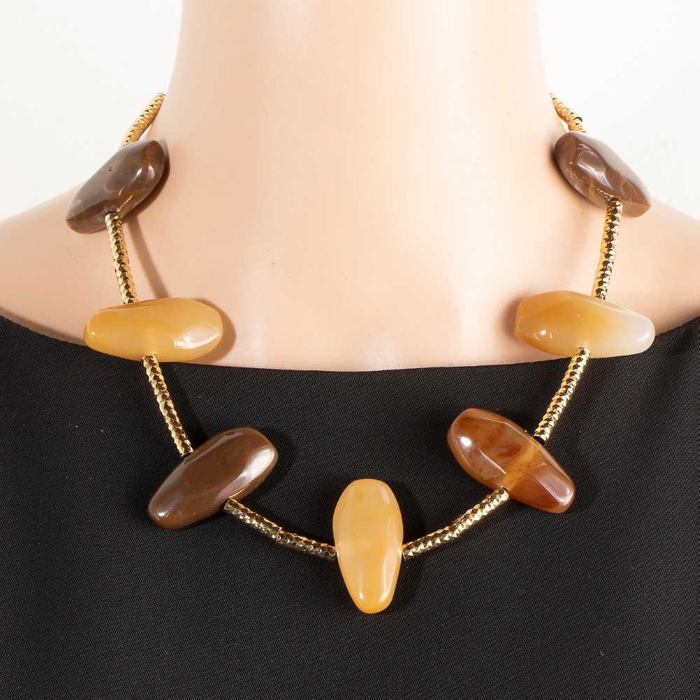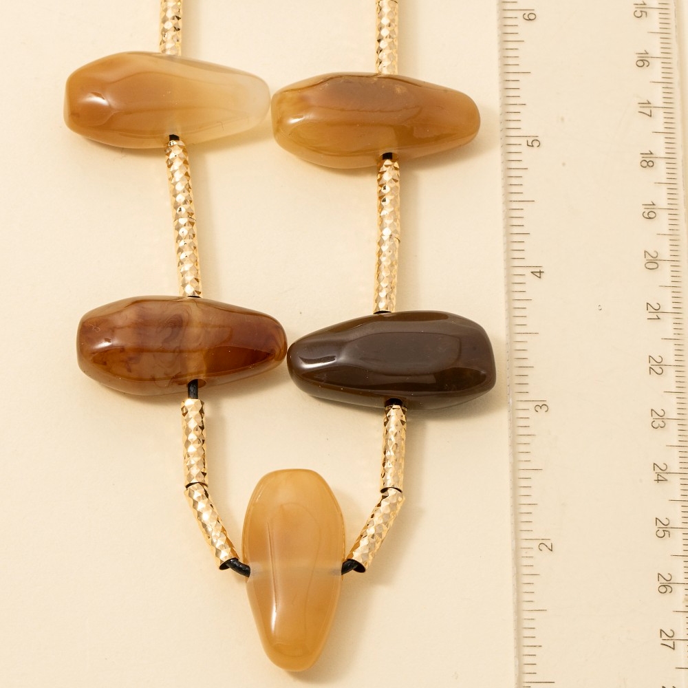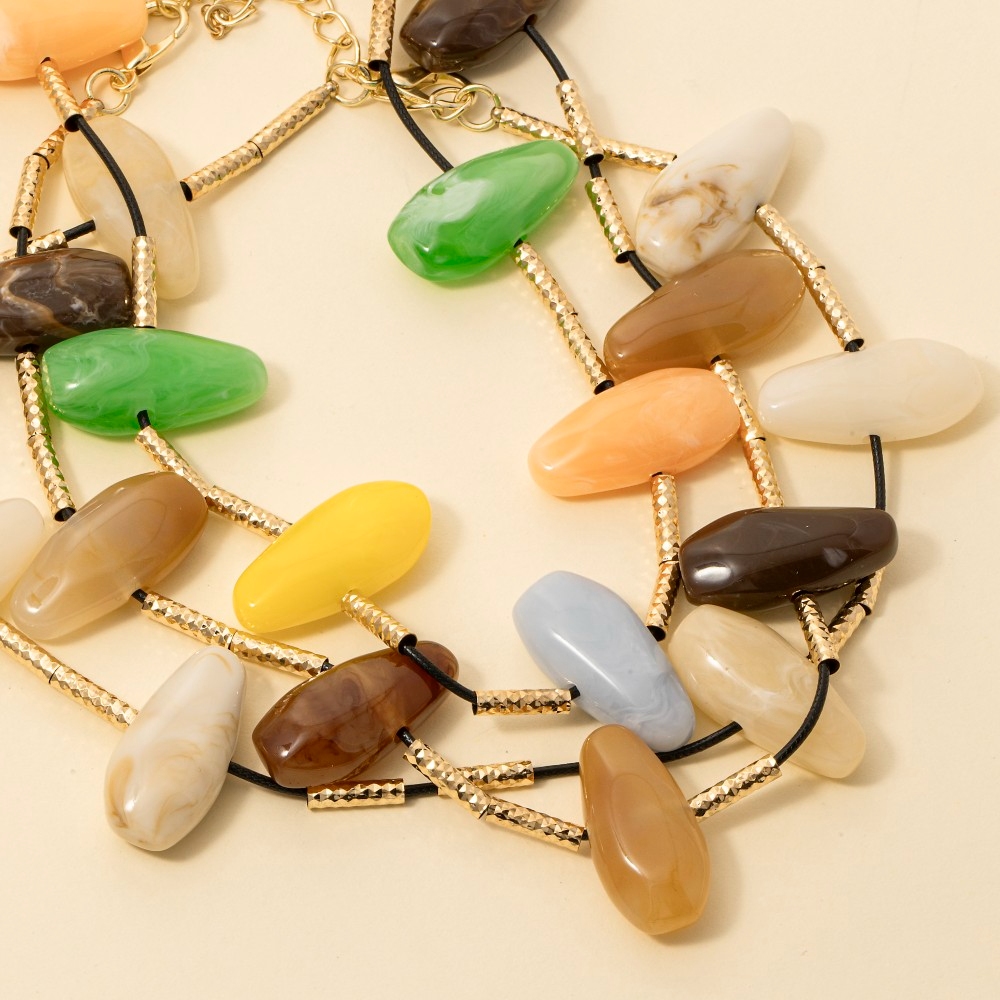 - This piece is perfect for those who want to showcase their unique style, this necklace emanates an elegant assorted resin stone charms design. This item is the perfect way to add some texture and interest to any outfit. Available in BR, IV, MU. This item is sold in packs of 1.