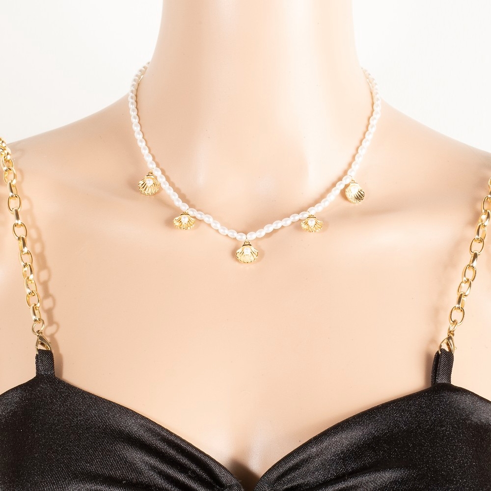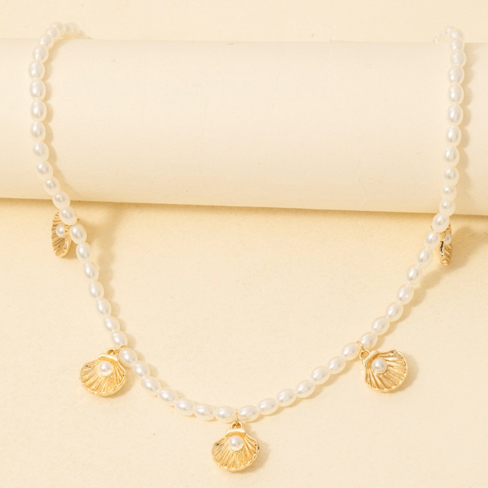 • Add a touch of luxury to any outfit, this necklace comes with a special clam shell charms pearl beaded design. Elevate your personal style effortlessly with this versatile necklace, an essential component for a refined wardrobe. Available in GCM. This item is sold in packs of 1.