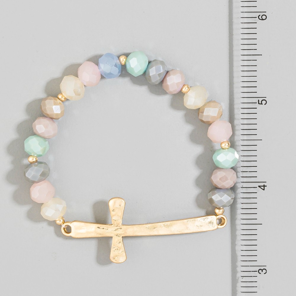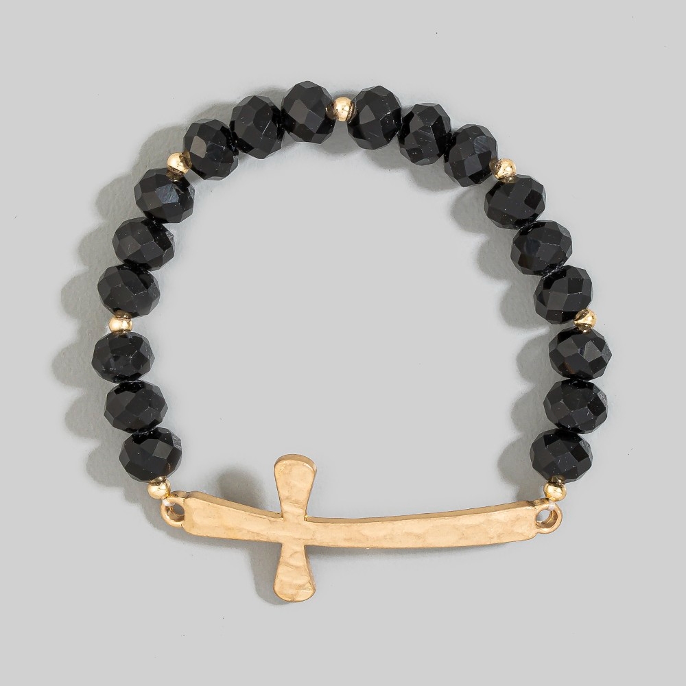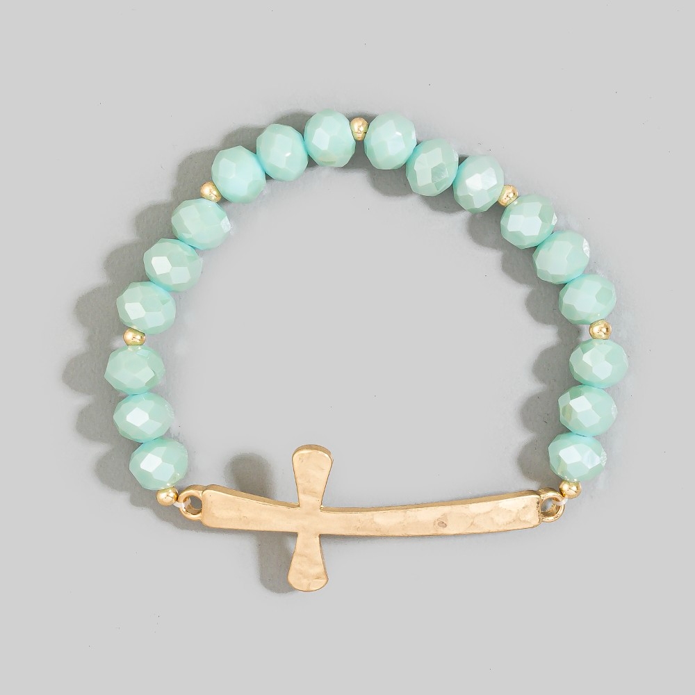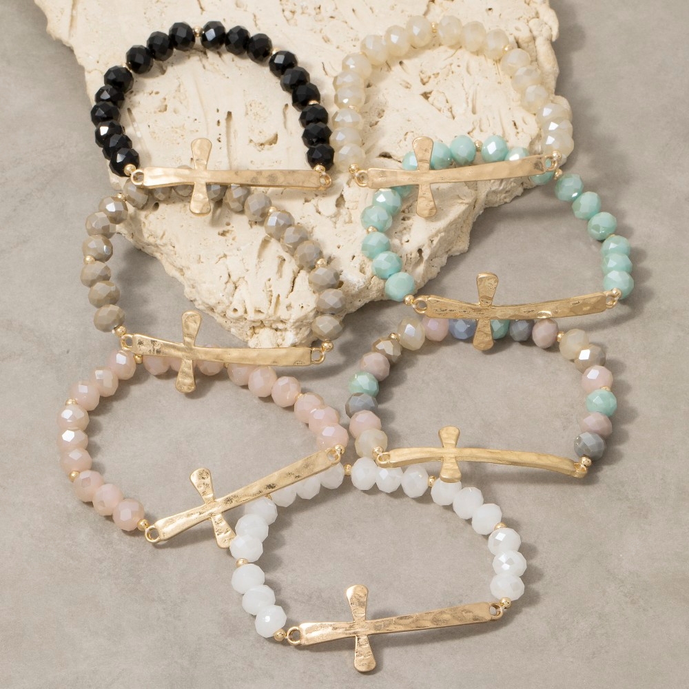 Sleek, modern, and always stylish, this stretch bracelet emanates an elegant faceted crystal bead with gold sideways cross design. Master the art of accessorizing with this versatile stretch bracelet, a key element for achieving a chic and polished look. Available in BLK, BPINK, BRW, LMUL, MINT, NAT, WHT. This item is sold in packs of 1.