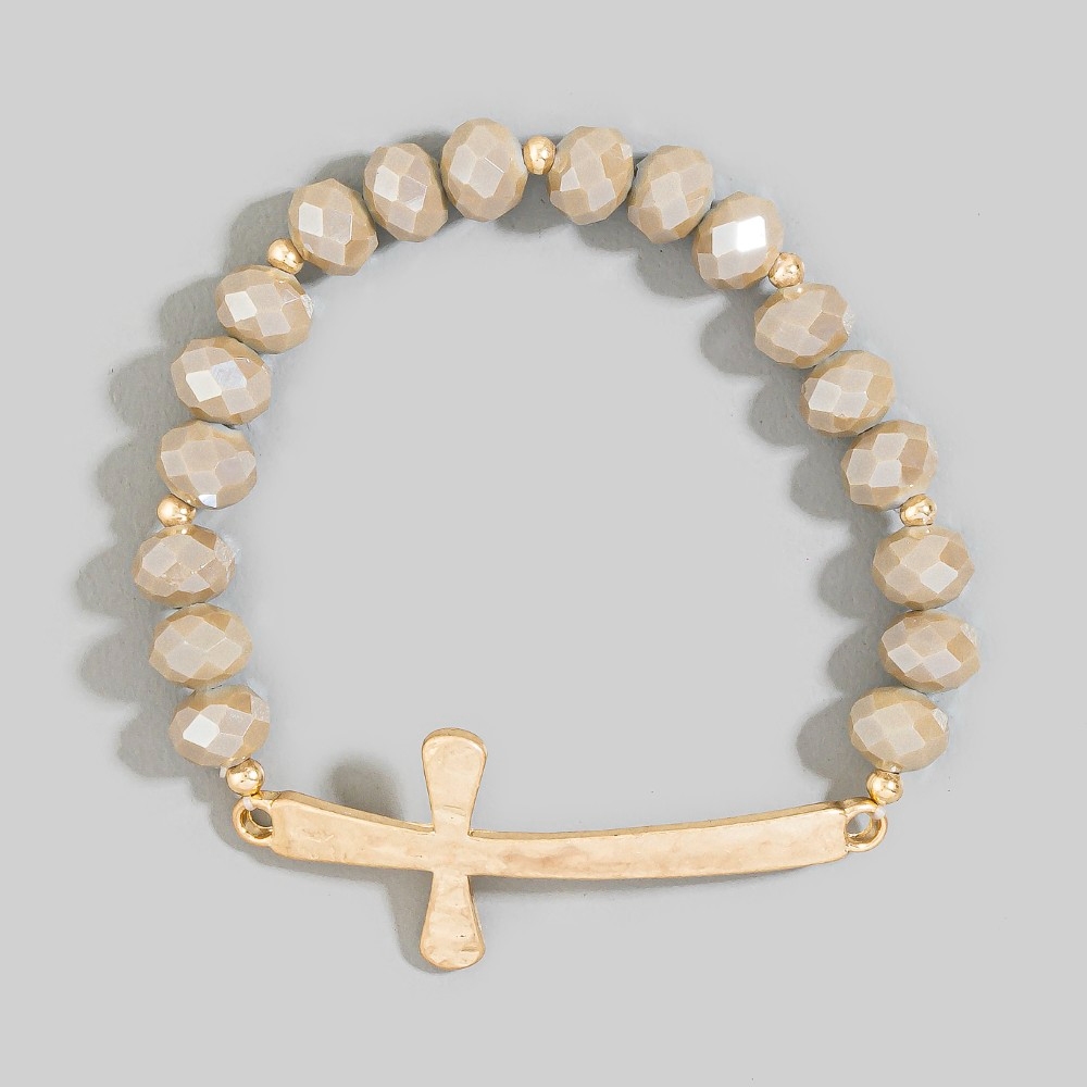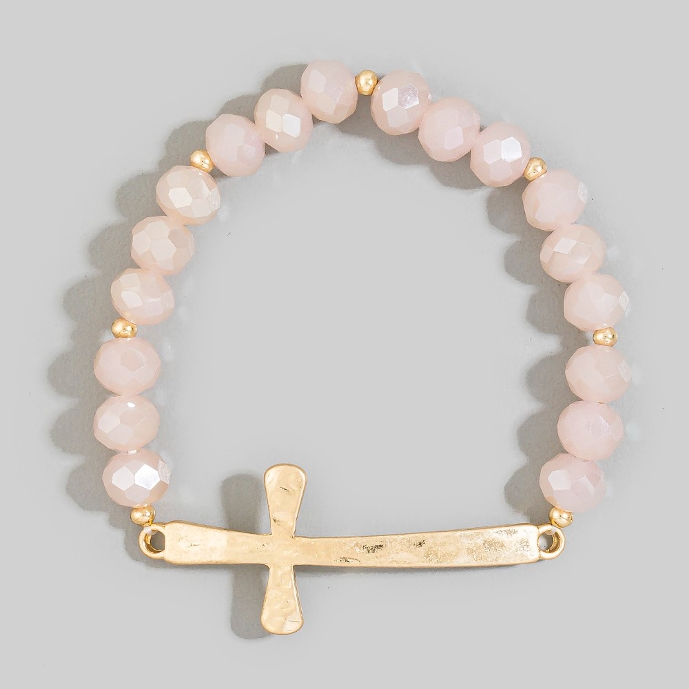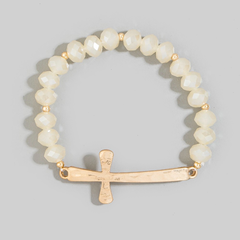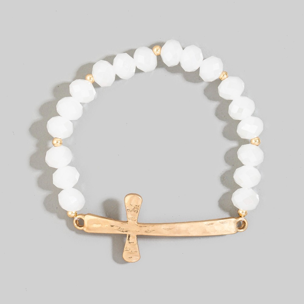 Sleek, modern, and always stylish, this stretch bracelet emanates an elegant faceted crystal bead with gold sideways cross design. Master the art of accessorizing with this versatile stretch bracelet, a key element for achieving a chic and polished look. Available in BLK, BPINK, BRW, LMUL, MINT, NAT, WHT. This item is sold in packs of 1.