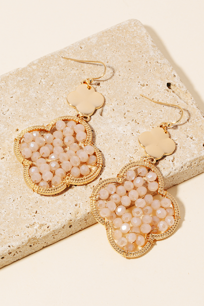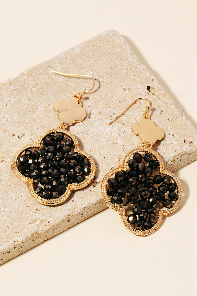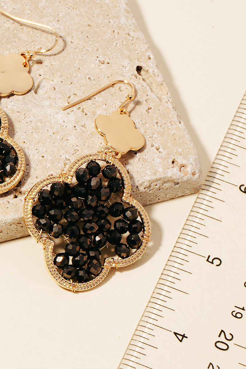 - A contemporary masterpiece, this pair of dangle earrings showcases an alluring faceted glass beaded clover design. It also includes a acrylic faux pearl. Redefine your fashion identity with this versatile pair of dangle earrings, a timeless piece that complements any wardrobe. Available in GDBK, GDPK and GDWH. This item is sold in packs of 1.