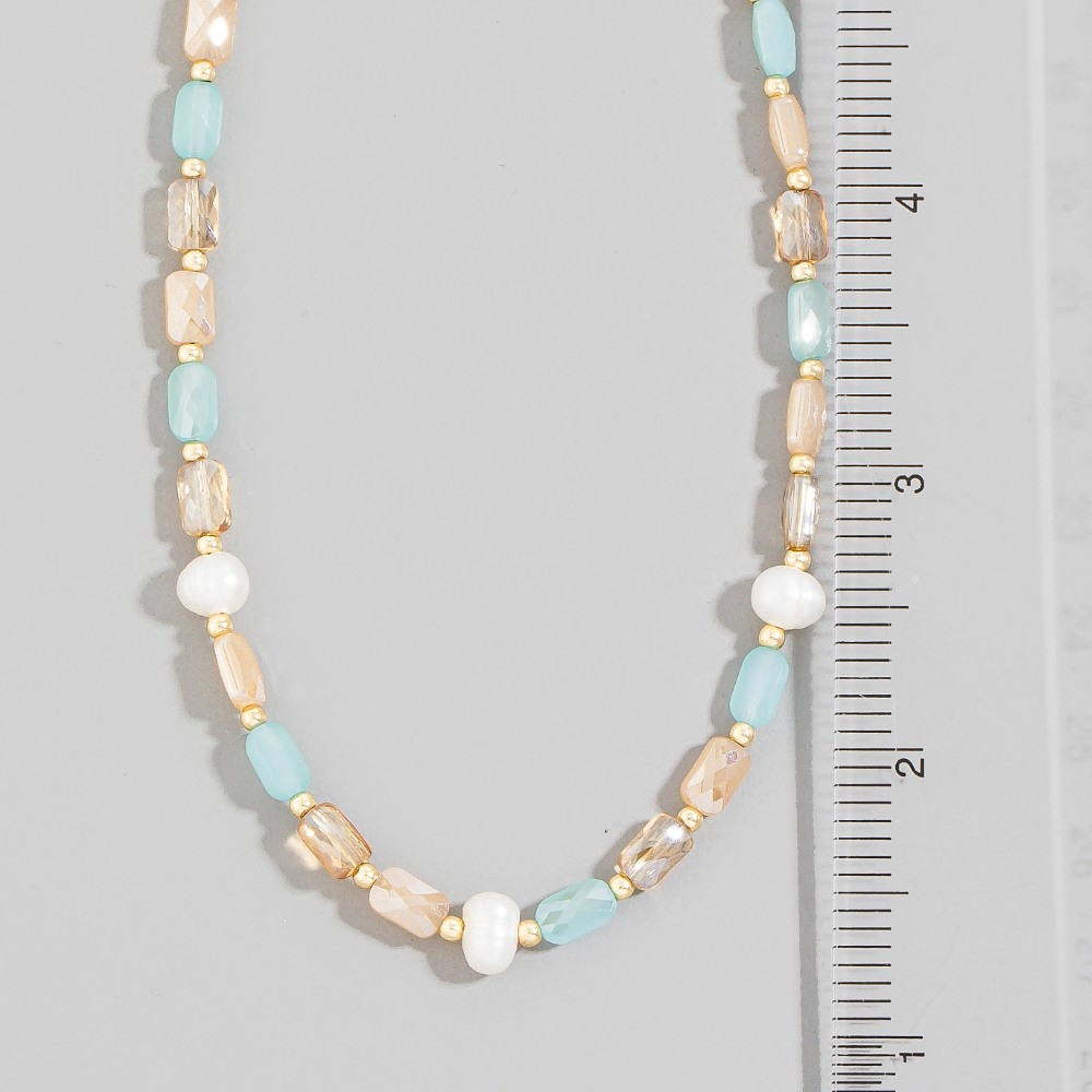 - This chain necklace is made with 60% Glass 10% Pearl 20% Plastic 10% Metal.