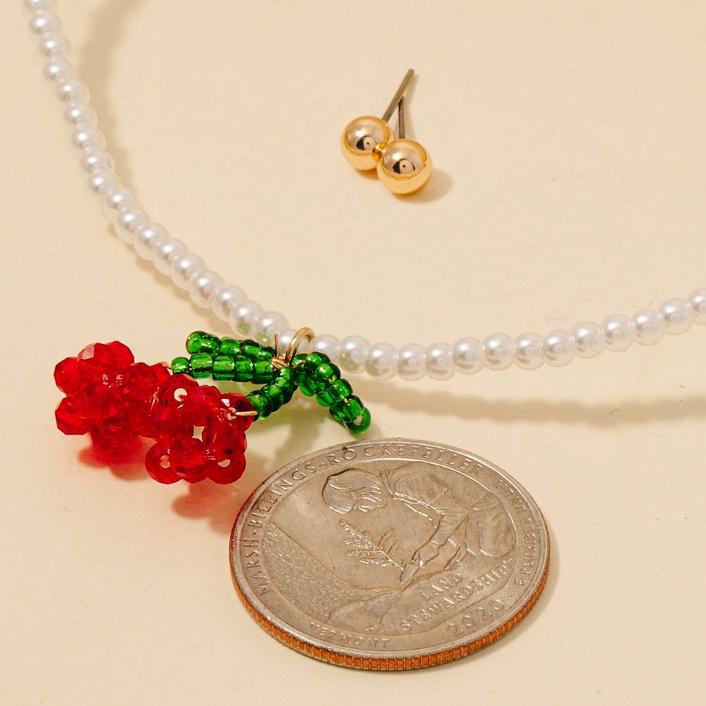 • Add some edge to your wardrobe, this necklace set brings a one-of-a-kind beaded cherry pendant pearl beaded design. Perfect for adding some texture and dimension to any outfit, this necklace set is a must-have. Available in RED. This item is sold in packs of 1.