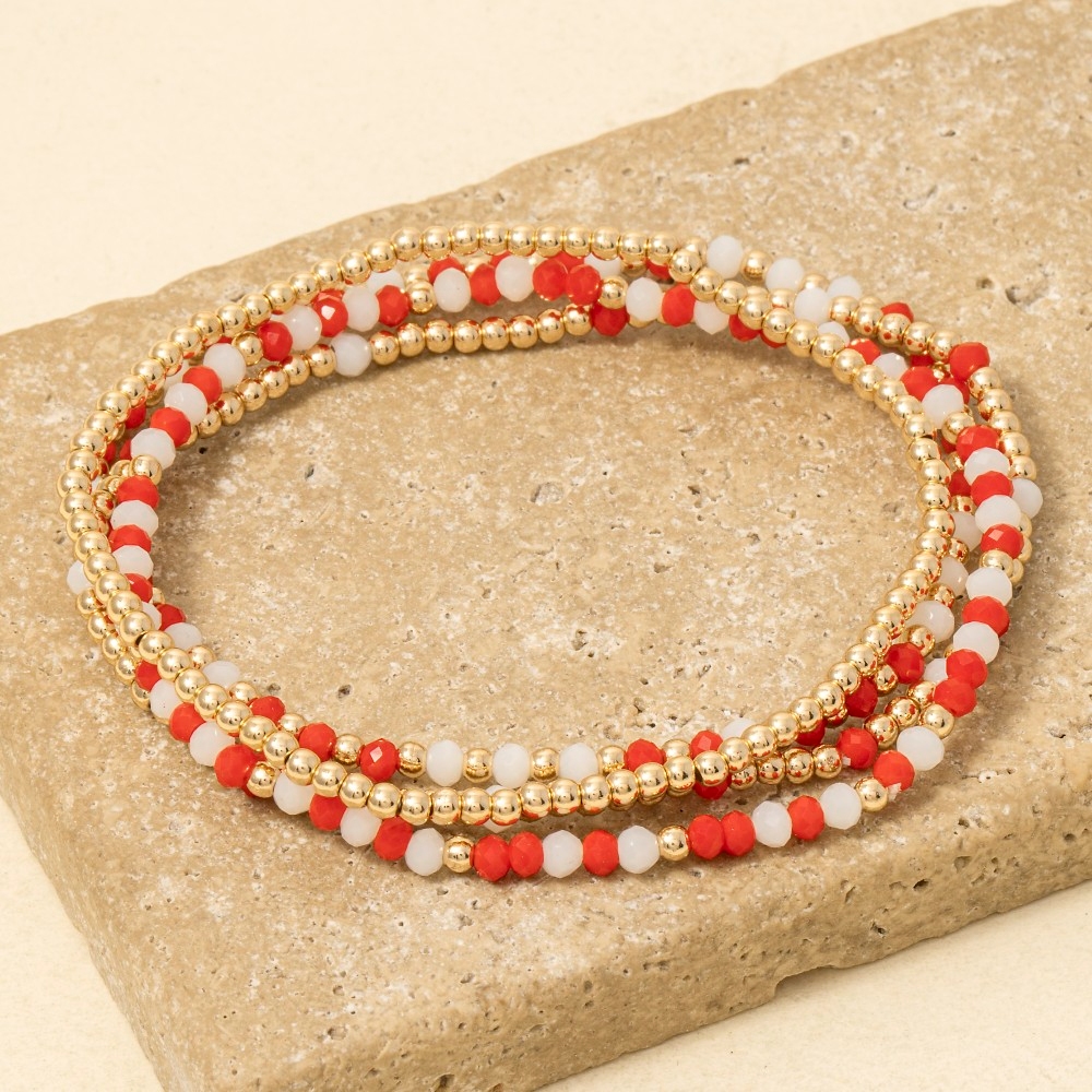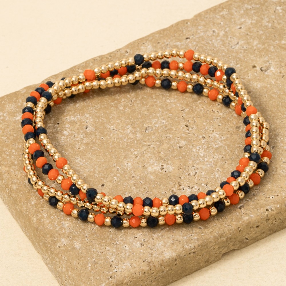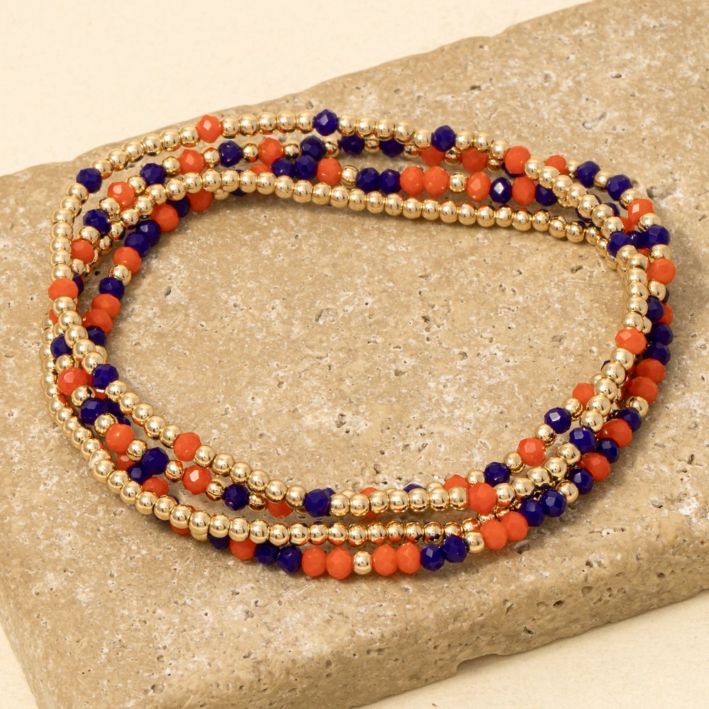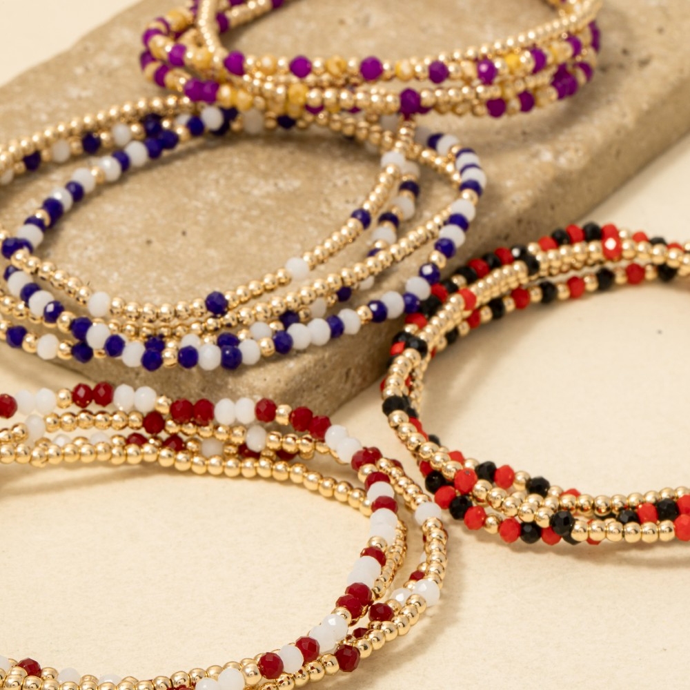 • A must-have addition to any bracelet collection, this game day bracelet flaunts a luxurious colorful and metallic beaded set design. Elevate your personal style effortlessly with this versatile bracelet, an essential component for a refined wardrobe. Available in BKRD, BUWH, MUBK, MUPU, ORMO, ORSA, ORWH, RDWH, SAWH. This item is sold in packs of 1.
