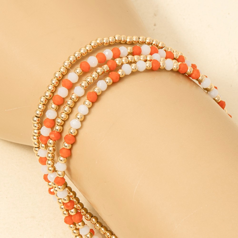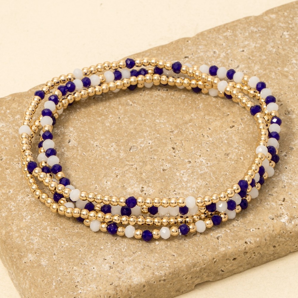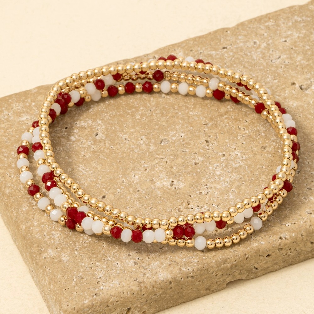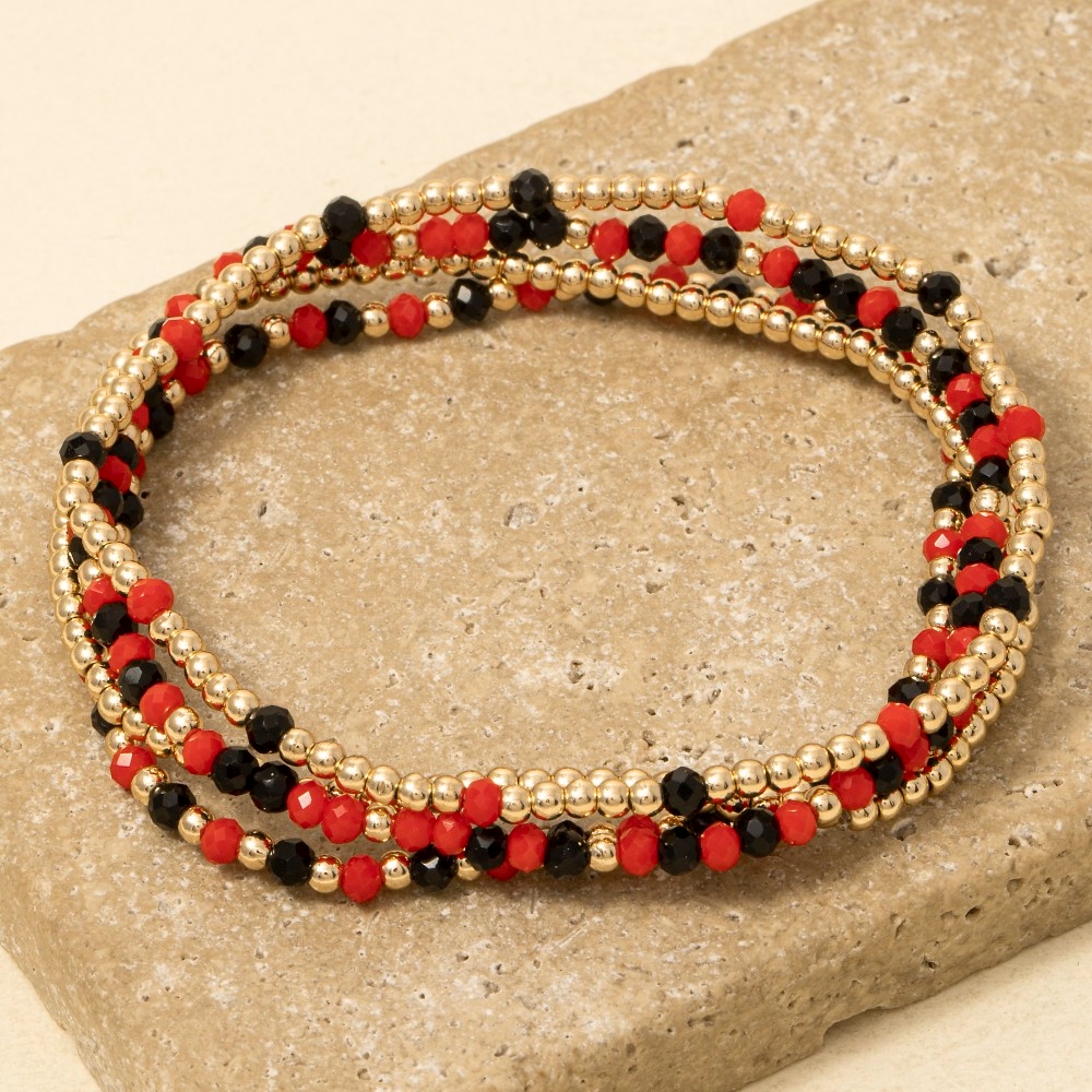 • A must-have addition to any bracelet collection, this game day bracelet flaunts a luxurious colorful and metallic beaded set design. Elevate your personal style effortlessly with this versatile bracelet, an essential component for a refined wardrobe. Available in BKRD, BUWH, MUBK, MUPU, ORMO, ORSA, ORWH, RDWH, SAWH. This item is sold in packs of 1.