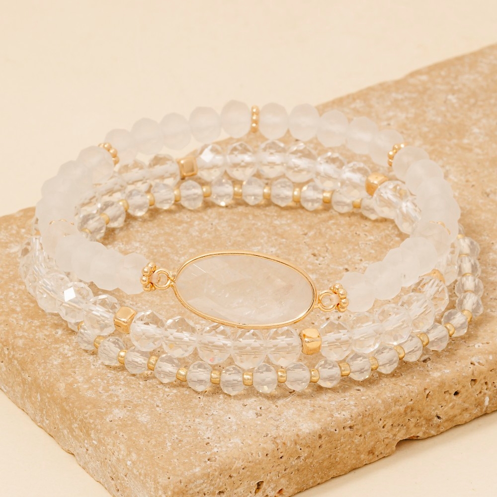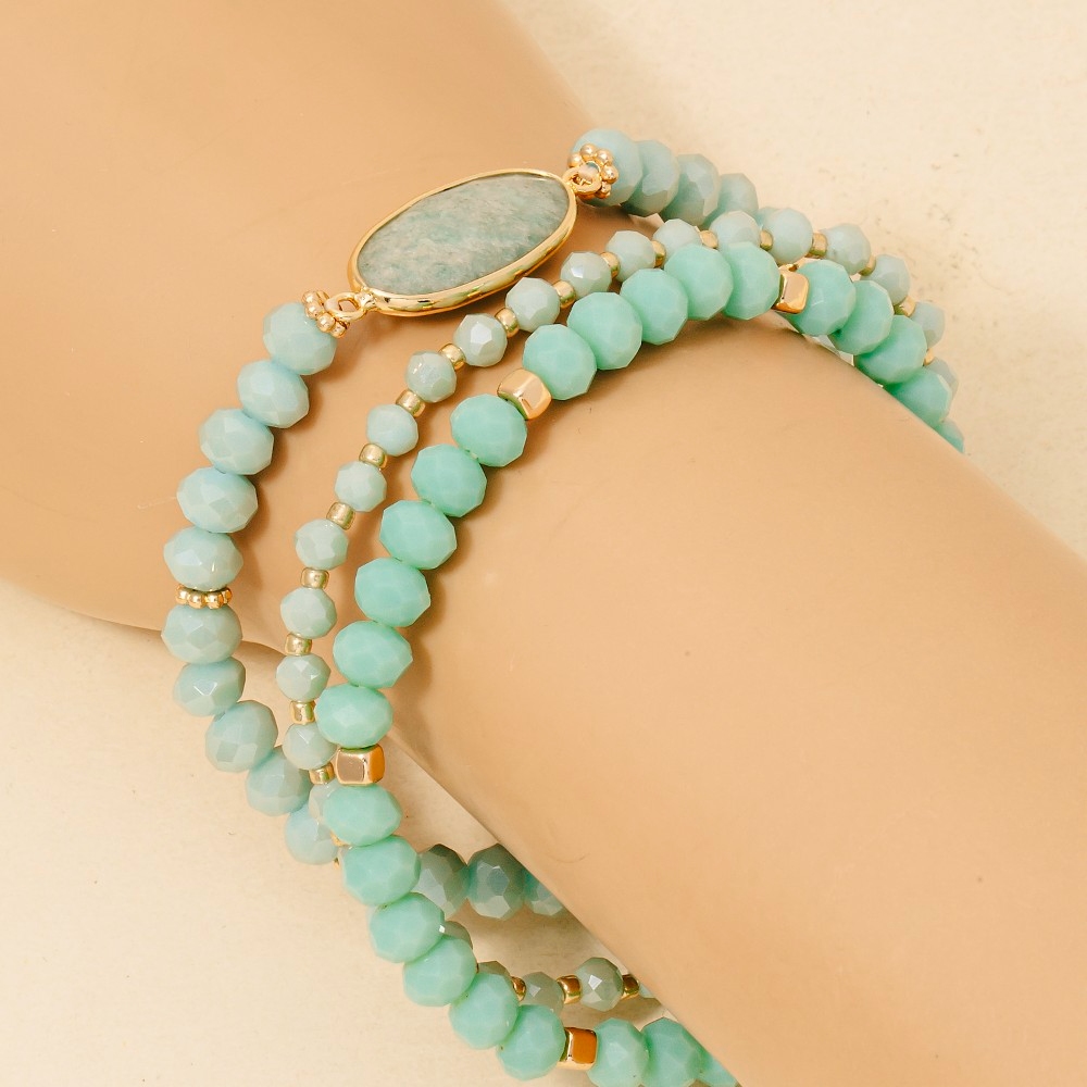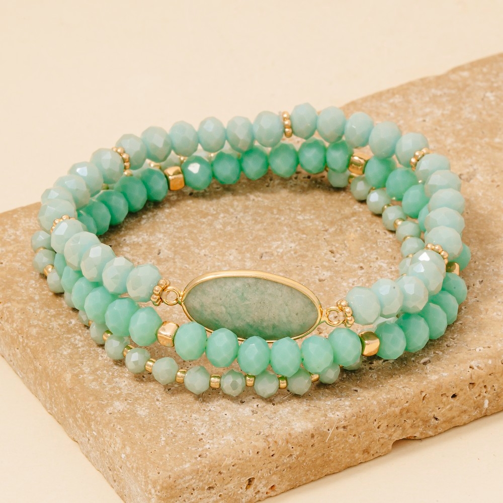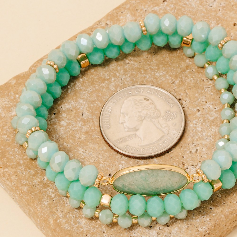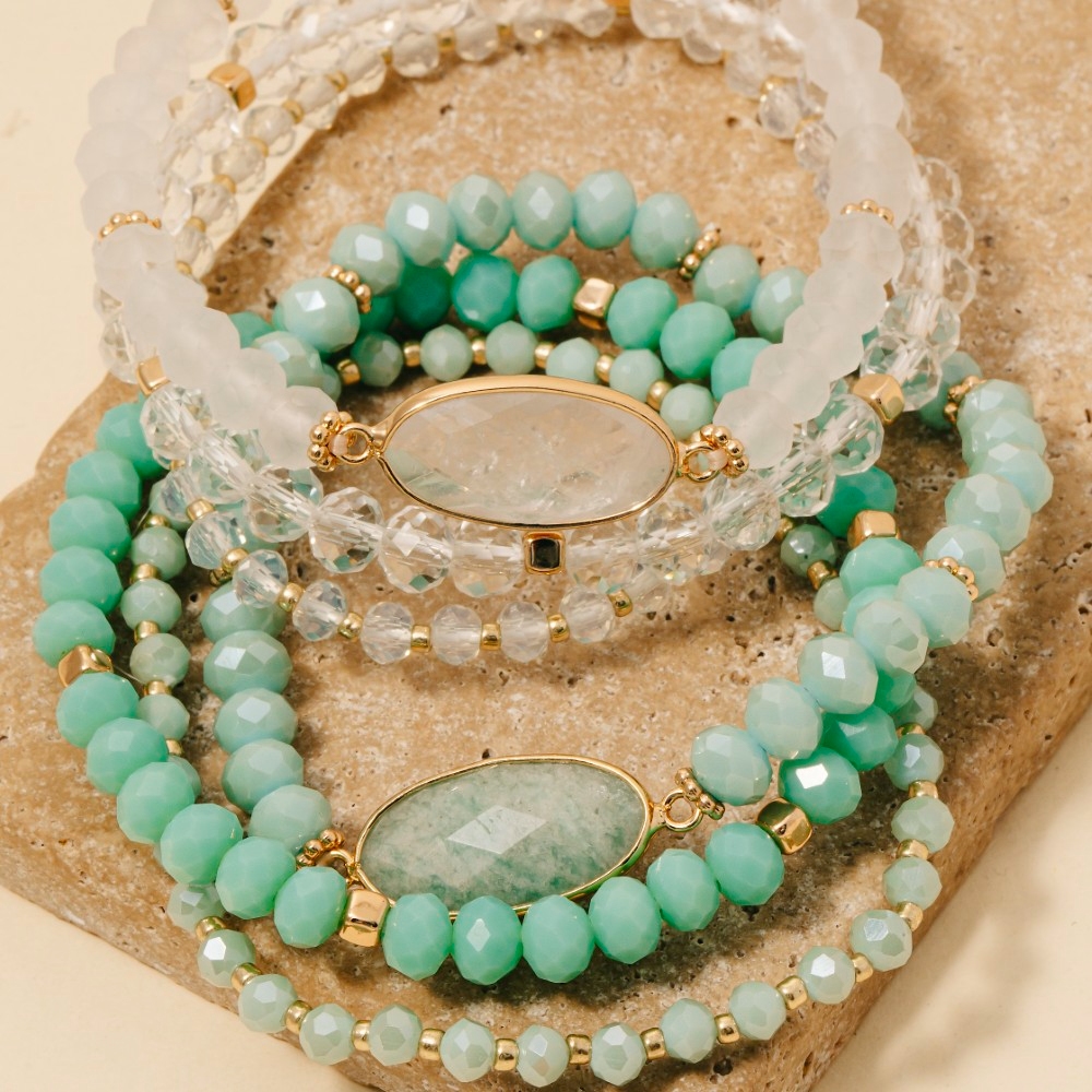 The perfect way to elevate any outfit, this bracelet showcases an alluring faceted oval stone charm mixed beaded set design. The perfect way to complete any outfit, whether you're dressing up or keeping it casual. Available in GDCR, GDMINT. This item is sold in packs of 1.