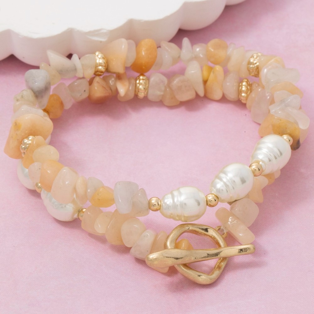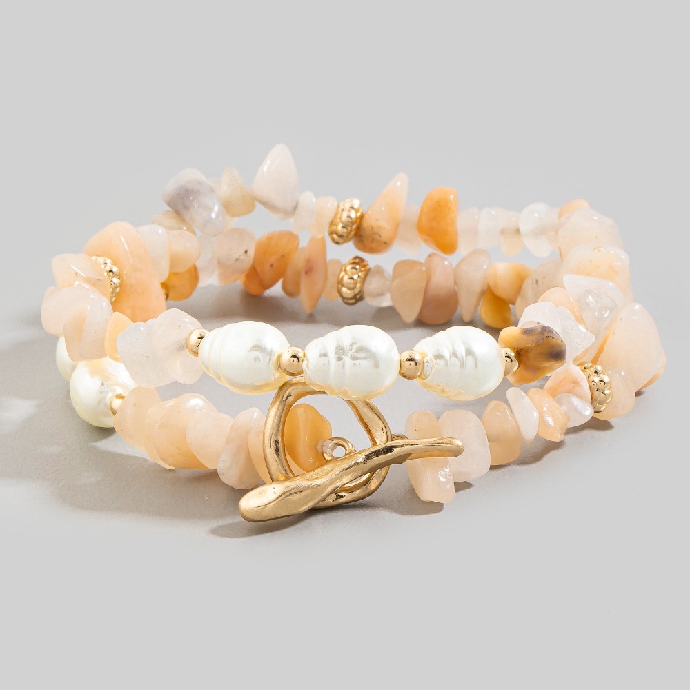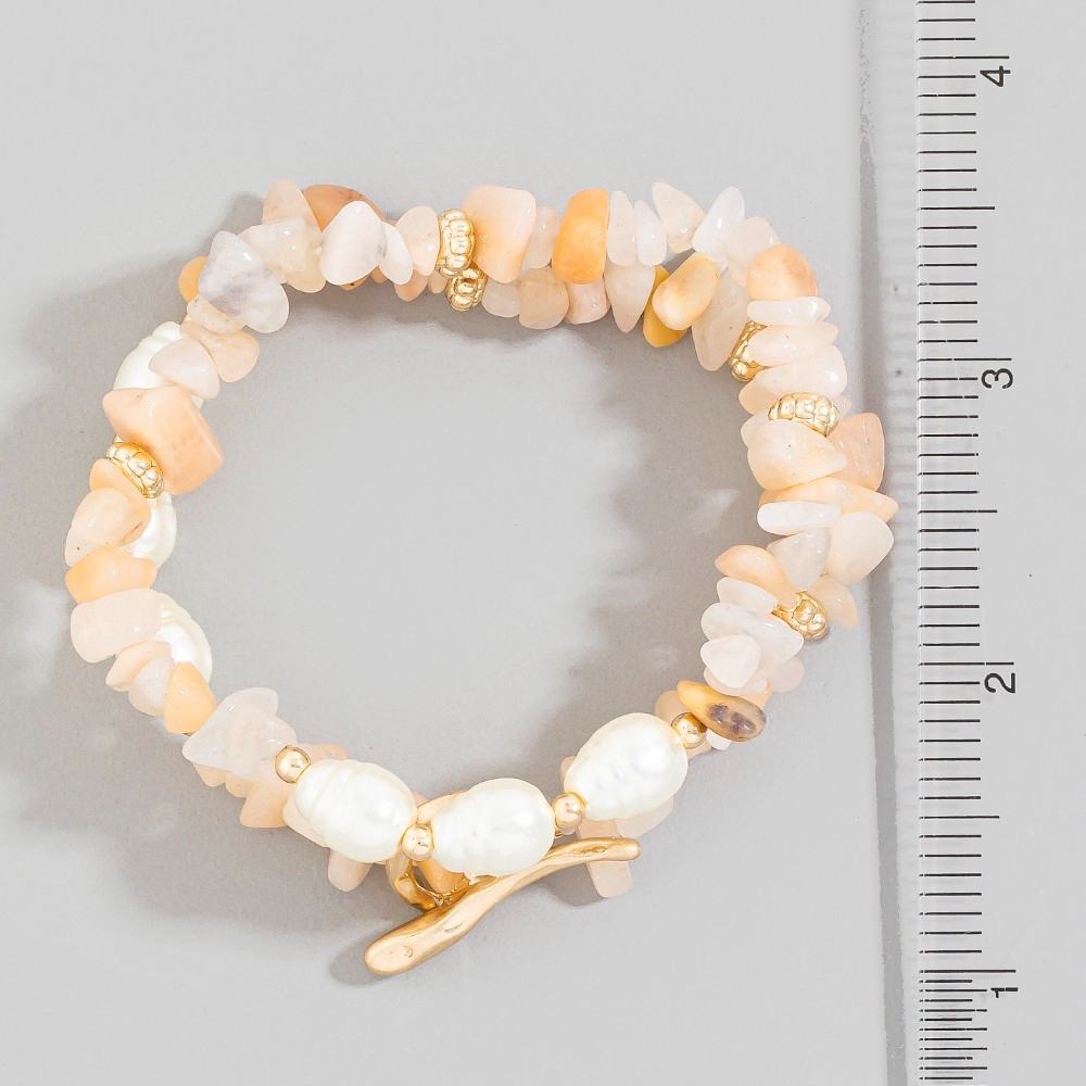 Perfect for any fashion-forward individual, this bracelet incorporates a flawless stone and pearl beaded set design. Perfect for adding a pop of color or texture to any outfit, this bracelet is a must-have. Available in WGCRY, WGMINT. This item is sold in packs of 1.
