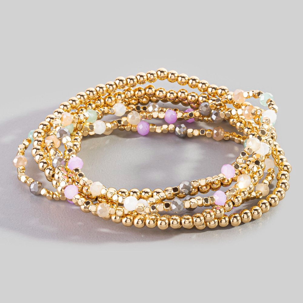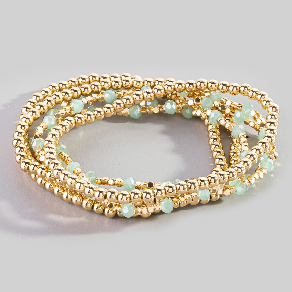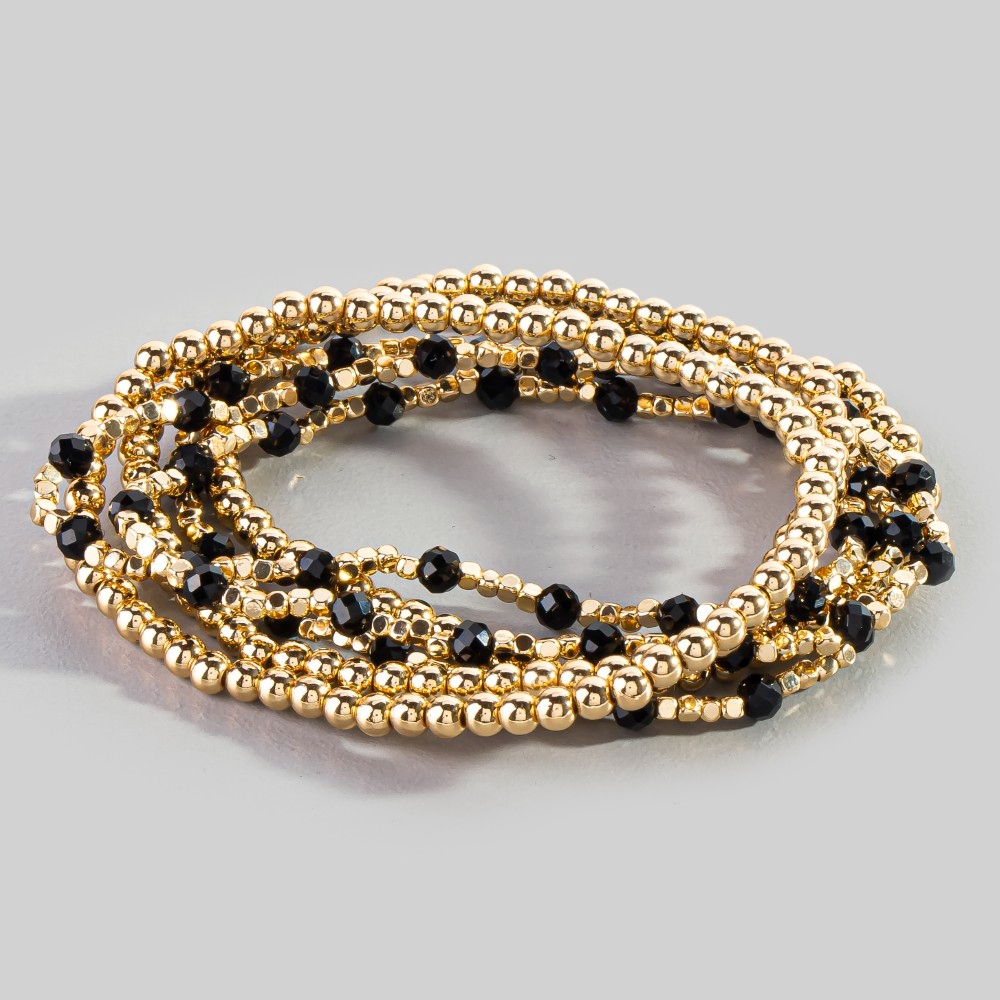 • Add a touch of luxury to any outfit, this bracelet comes with a special metallic and faceted beaded elastic set design. The perfect way to elevate any outfit, this bracelet adds a touch of elegance and style. Available in BLACKGD, LMULTIGD, MINTGD, WHITEGD. This item is sold in packs of 1.