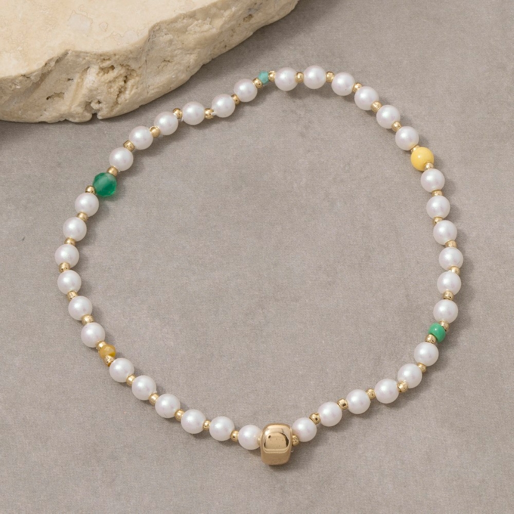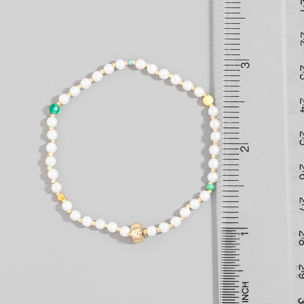 - This bracelet is made with 20% Brass, 60% Acyrlic Pearl, 10% Glass and 10% Gemstone.
