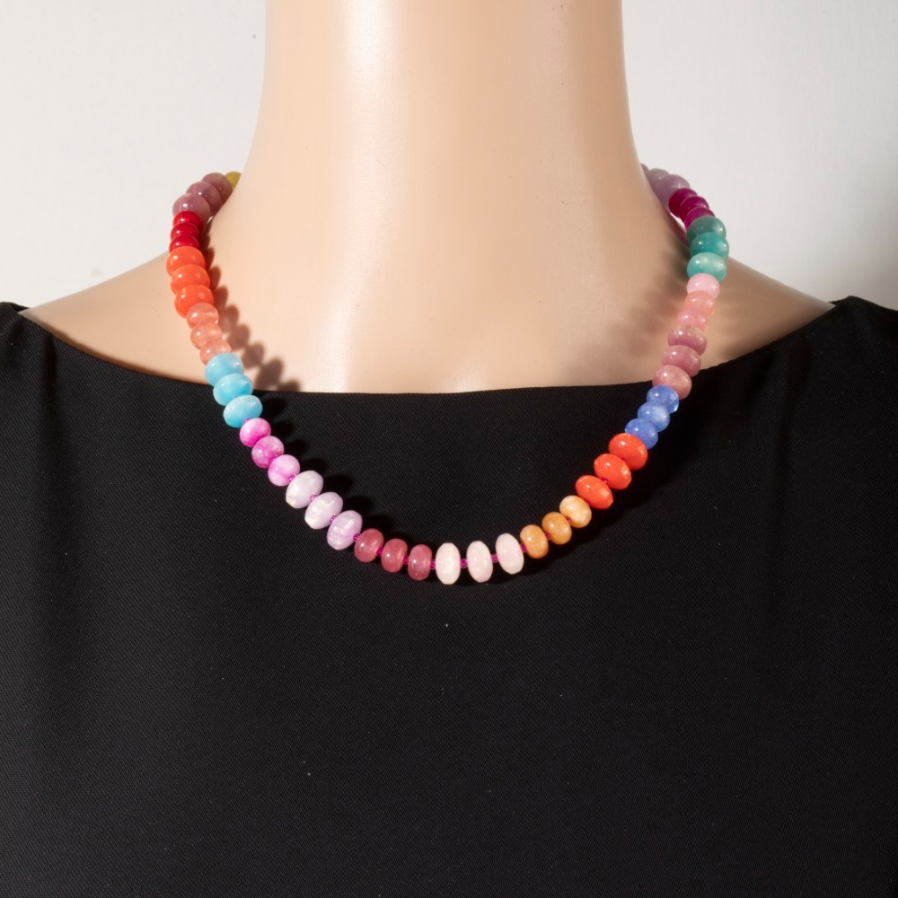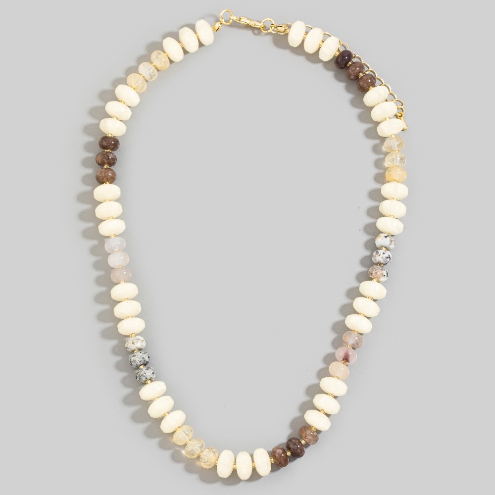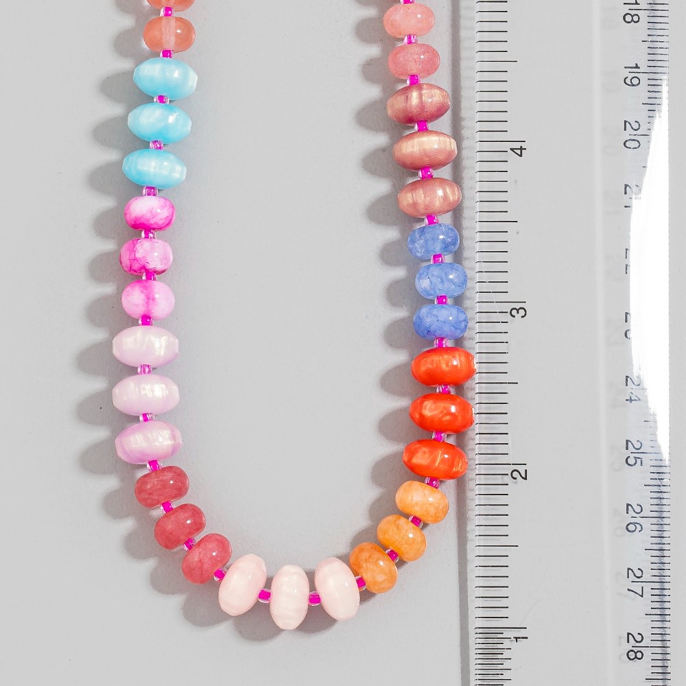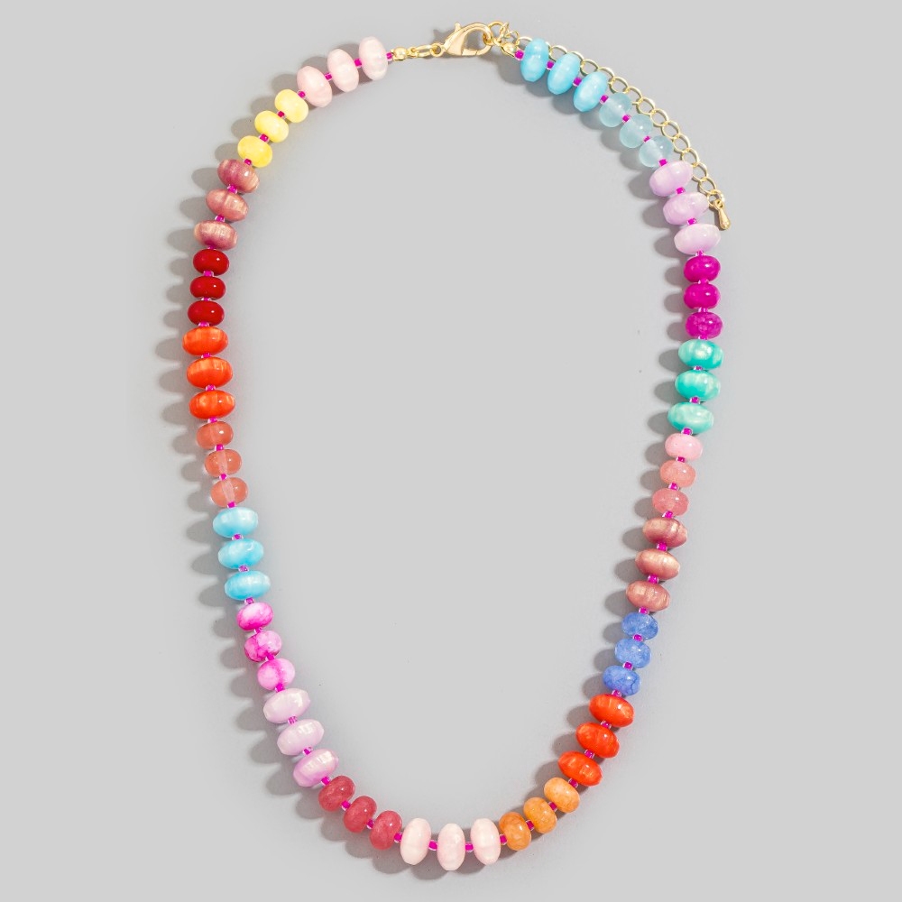 - This piece is both elegant and versatile, this necklace flaunts a luxurious mixed glass and resin disc beaded design. Perfect for adding a touch of glamour and sophistication to any outfit, this necklace is a must-have. Available in GM, GNT. This item is sold in packs of 1.
