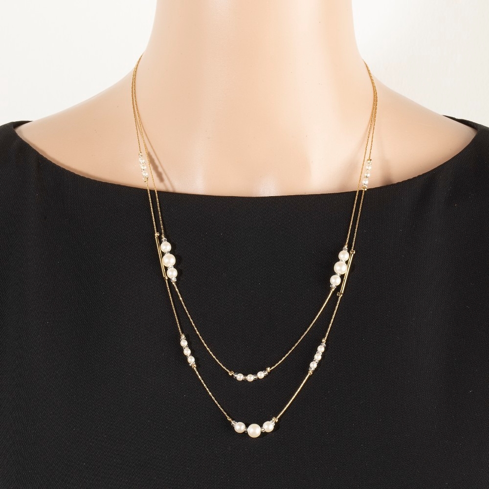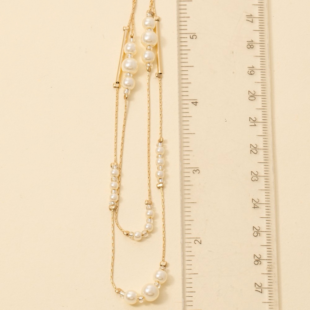 • The epitome of sophistication and style, this necklace incorporates a remarkable pearl beaded rows layered dainty chains design. Perfect for any occasion, this versatile necklace will enhance any outfit you wear. Available in G. This item is sold in packs of 1.