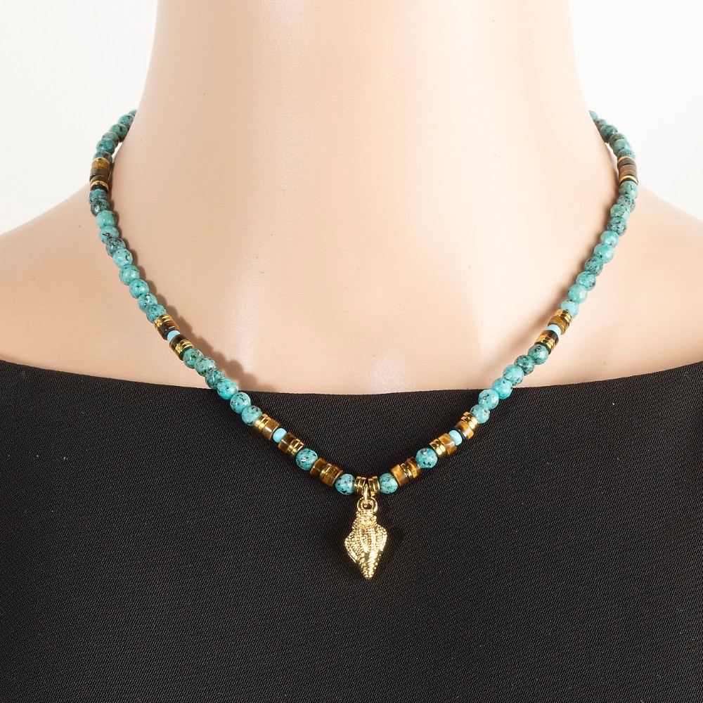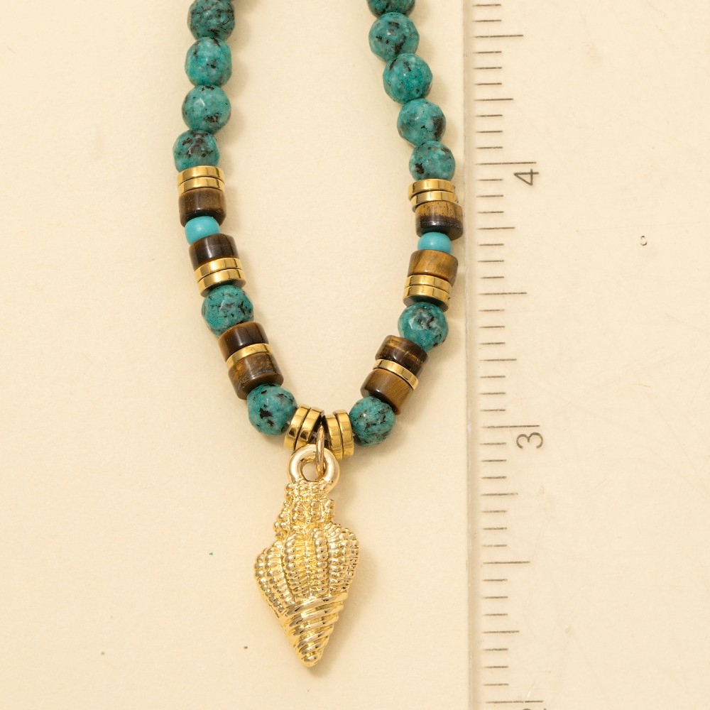 • This piece is both elegant and versatile, this necklace presents a striking spiral sea shell mixed turquoise beaded design. A stylish necklace that's perfect for complementing any outfit you wear. Available in BL. This item is sold in packs of 1.