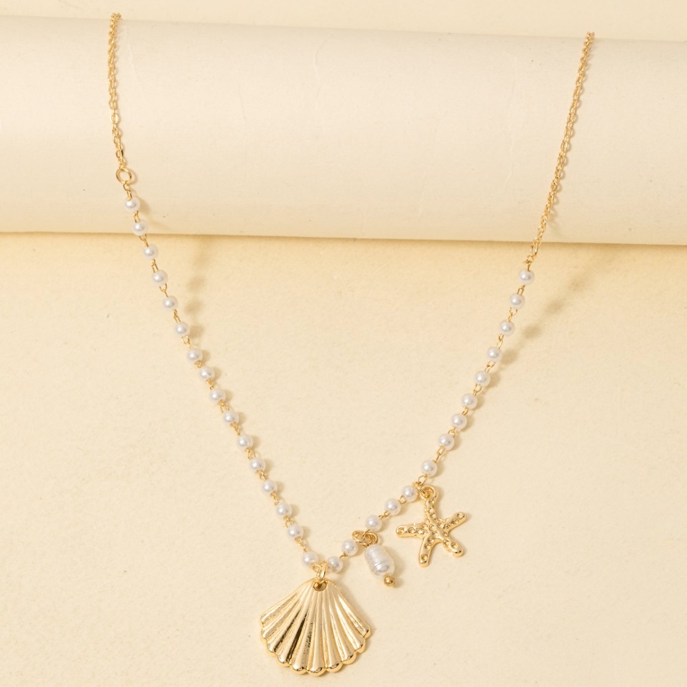 • Effortlessly elevate your outfit, this necklace emanates an elegant starfish and clam shell charms pearl beaded design. Make a lasting impression with this versatile necklace, a subtle yet impactful addition to your fashion repertoire. Available in G. This item is sold in packs of 1.