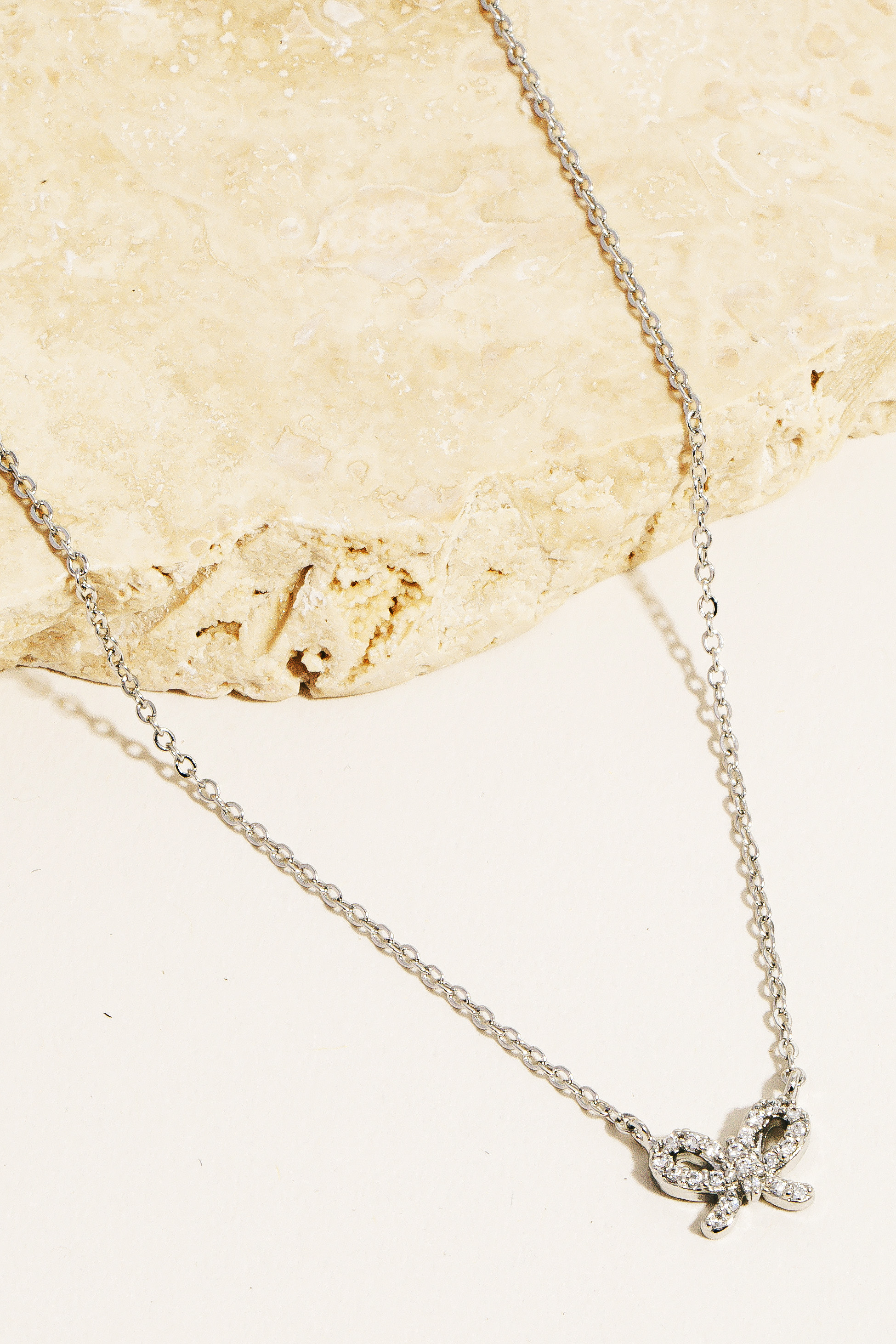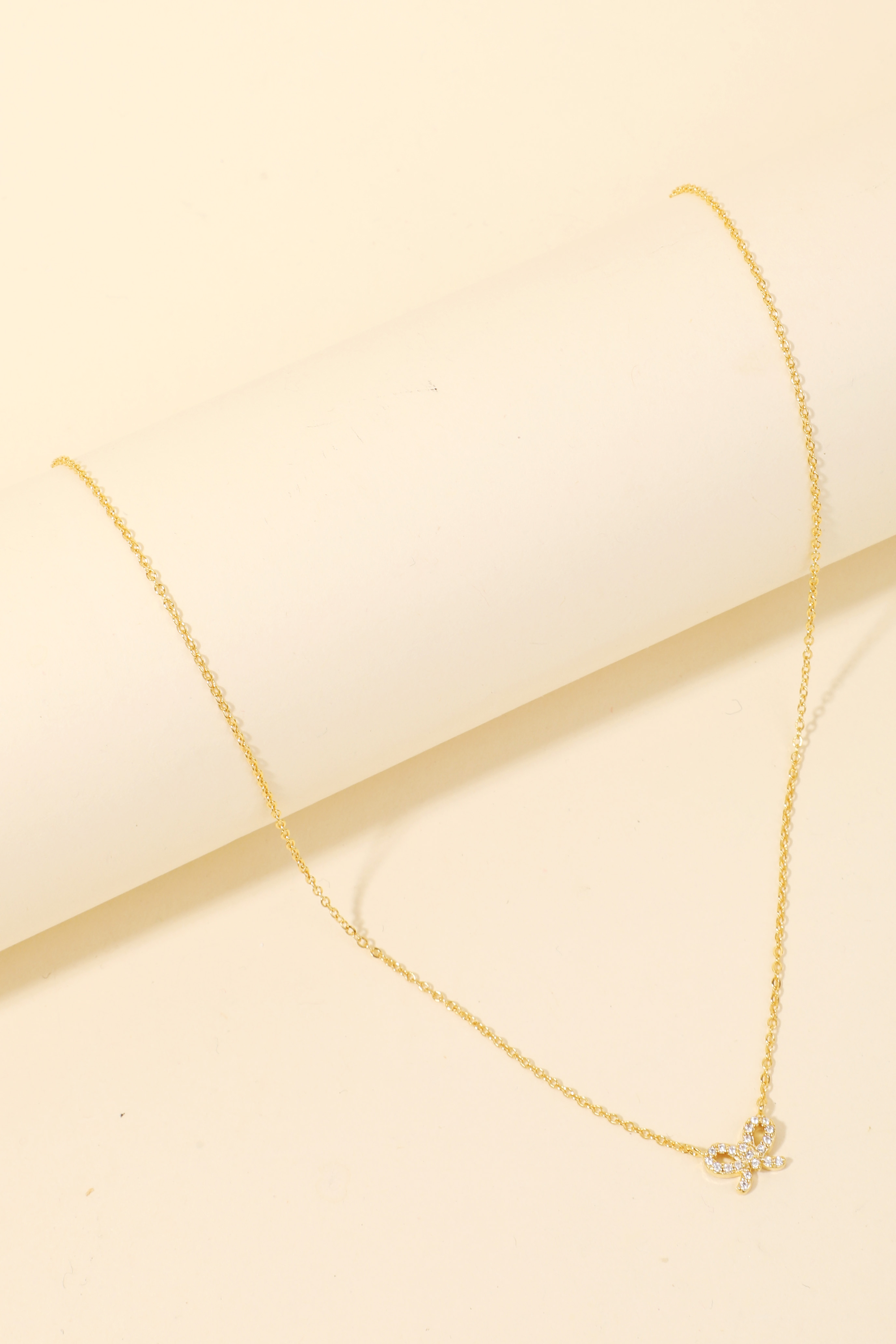 • This season's hottest chain necklace, this chain necklace features an exceptional cz pave ribbon bow pendant design. The perfect way to elevate any outfit, this chain necklace adds a touch of elegance and style. Available in G, S. This item is sold in packs of 1.