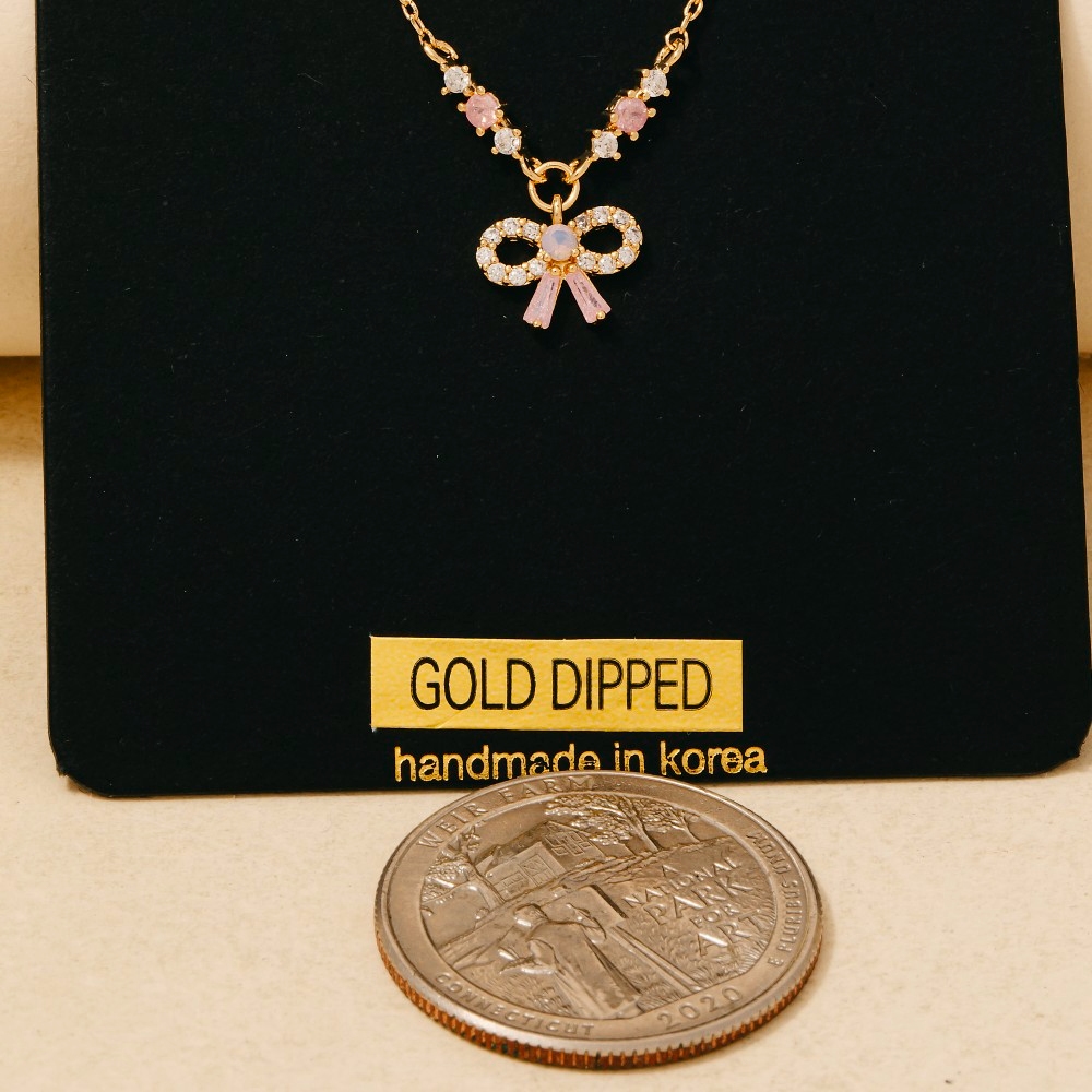 • A stunning piece that is sure to turn heads, this necklace shows off a distinctive gold dipped cubic zirconia ribbon bow tie pendant design. Elevate your fashion ensemble effortlessly with this versatile necklace, a stylish choice for the modern trendsetter. Available in G. This item is sold in packs of 1.