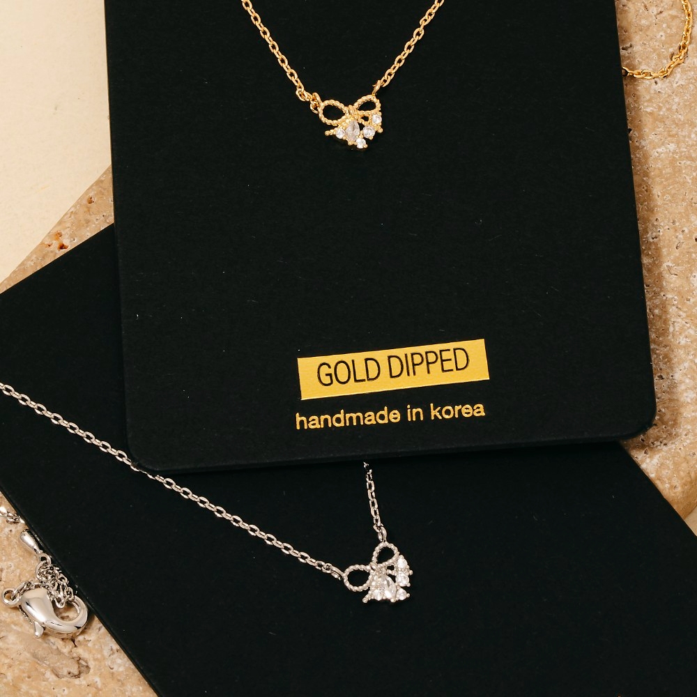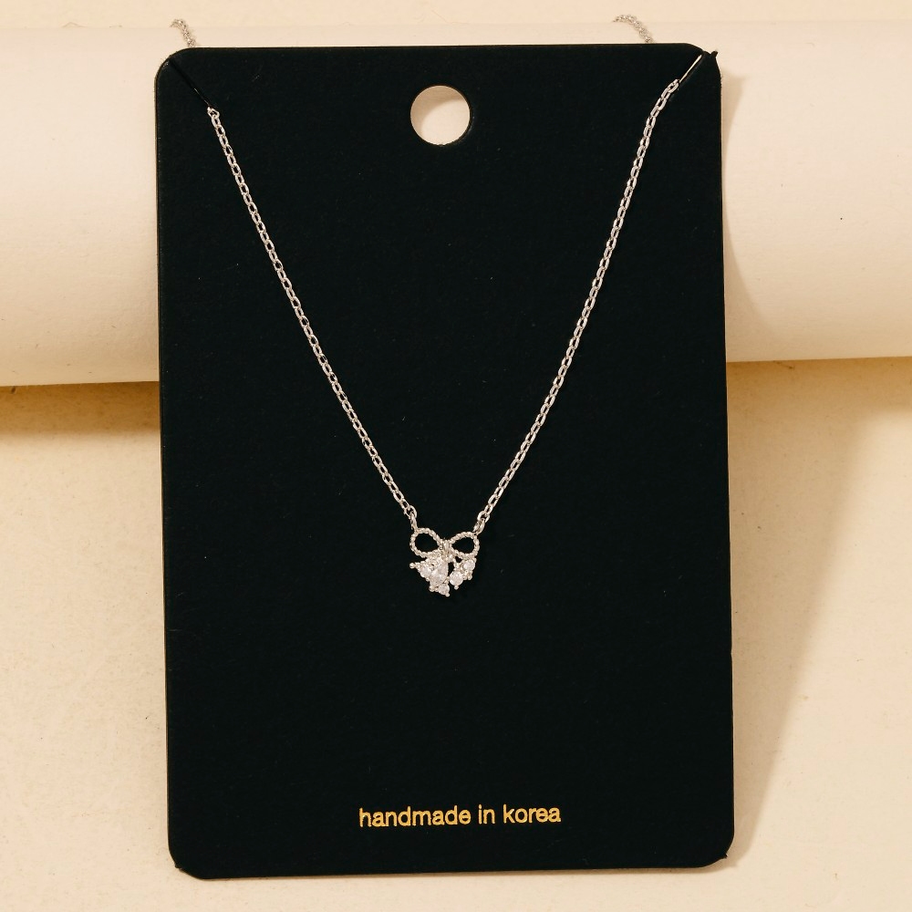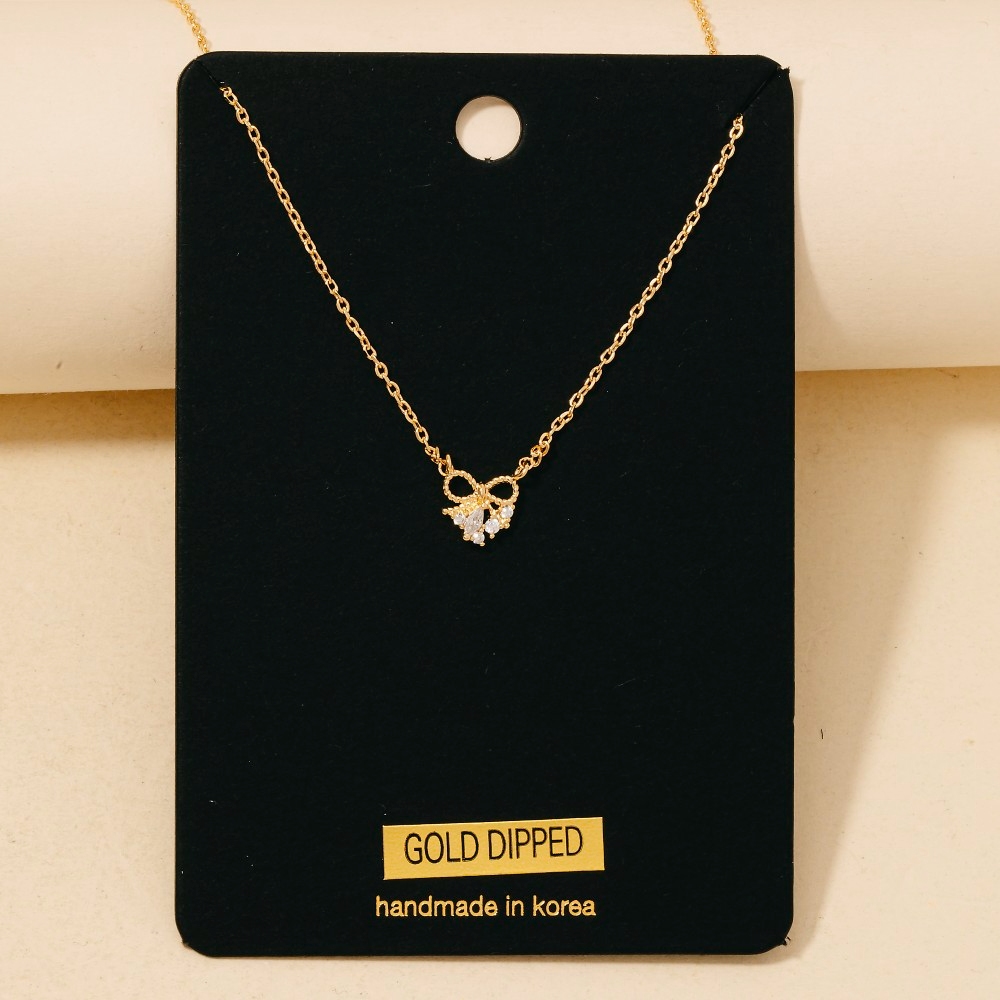 • Perfect for any fashion-forward individual, this necklace exudes a refined gold dipped cubic zirconia studded bow pendant design. This necklace is the perfect way to add a touch of elegance to any outfit. Available in G, S. This item is sold in packs of 1.