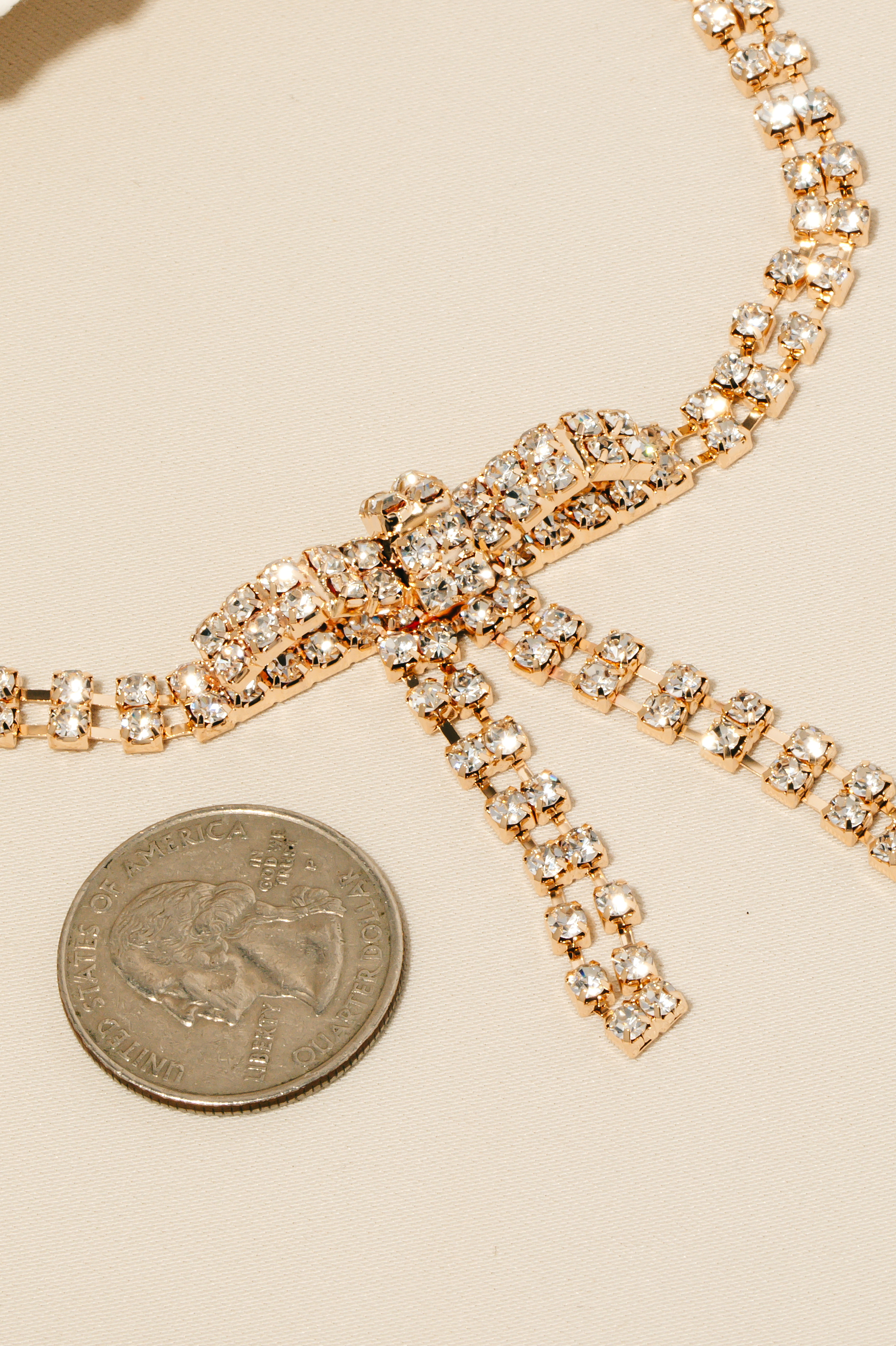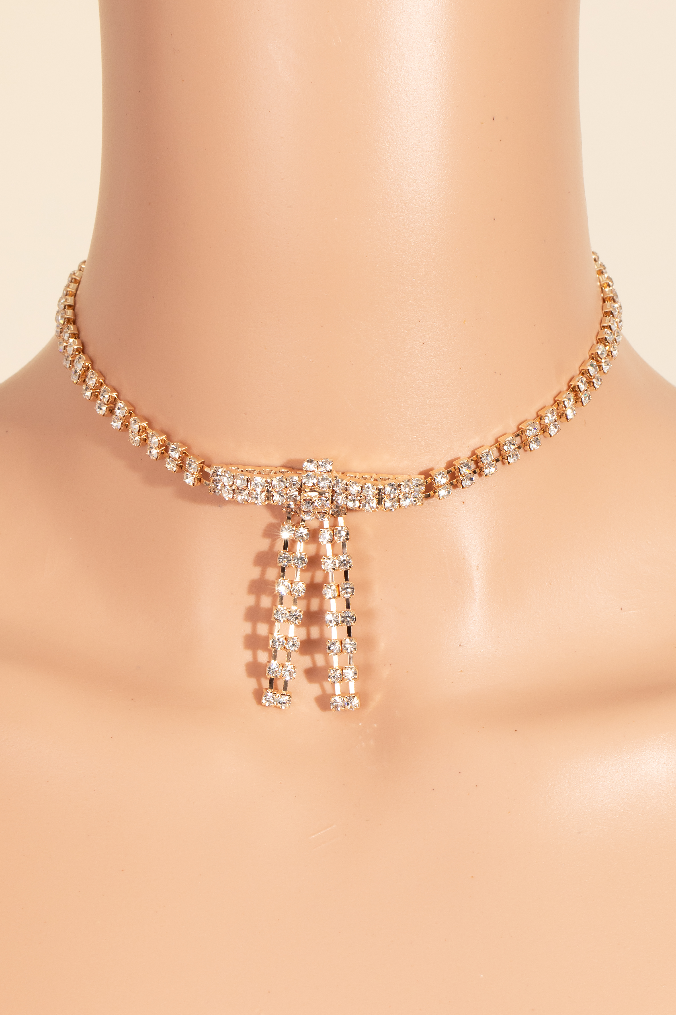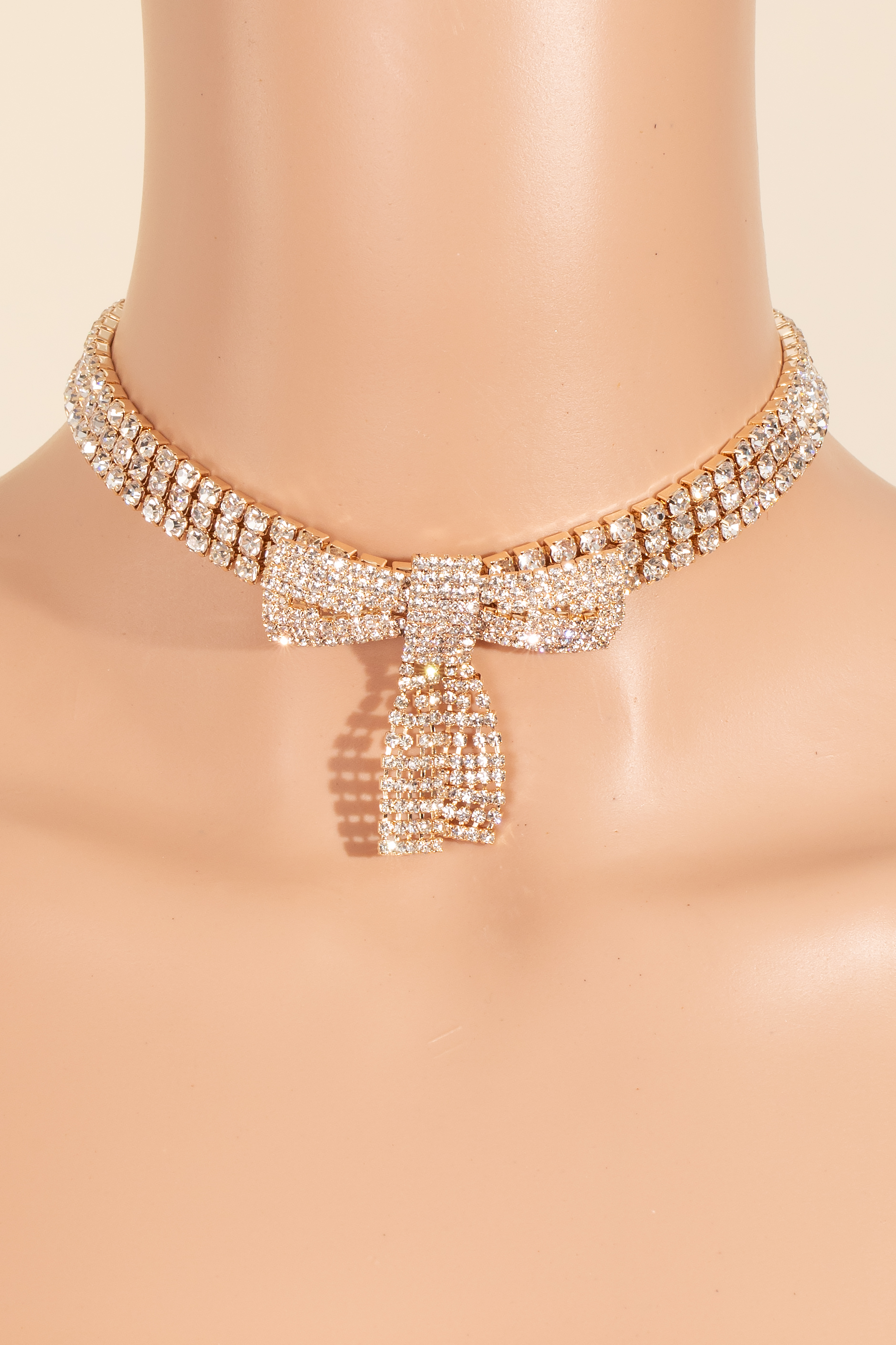 The epitome of sophistication and style, this necklace radiates a sleek rhinestone chain bow choker design. This accessory is a great way to add some flair to your outfit without going over the top. Available in G and S. This item is sold in packs of 1.