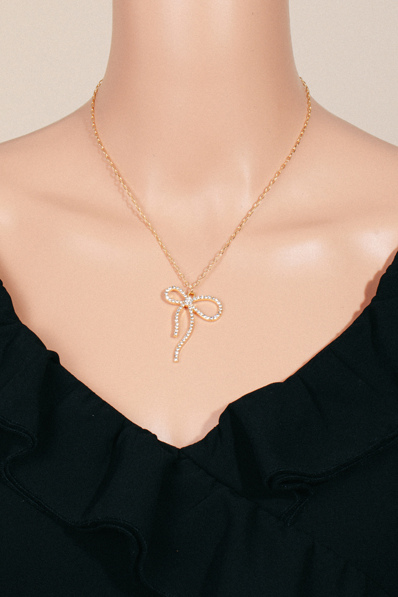• A unique and stylish piece that sets you apart, this chain necklace evokes a captivating solid rhinestone ribbon bow pendant design. This item adds the perfect finishing touch to any outfit, making it stand out from the crowd. Available in GDCR and RHCR. This item is sold in packs of 1.