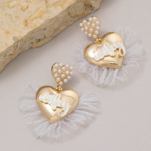 Enamel Wifey Pearl And Metallic Heart Stud Dangle Earrings