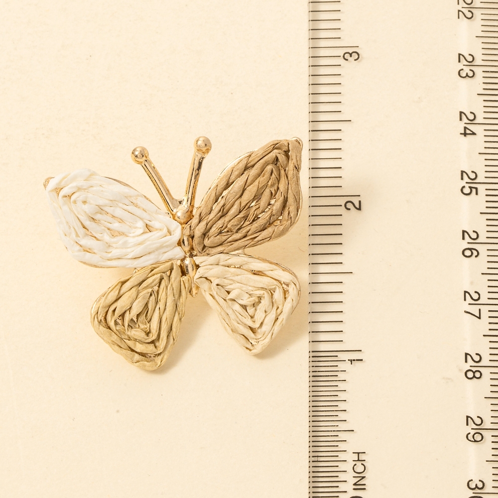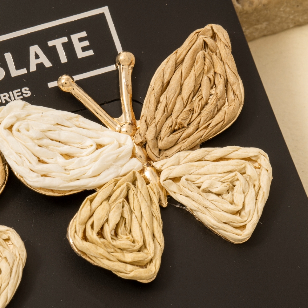 This piece is a true showstopper, this pair of earrings radiates a sleek triple tone straw weave butterfly design. Transform your outfit into a fashion masterpiece with this versatile pair of earrings, an essential for the style-conscious individual. Available in MU. This item is sold in packs of 1.