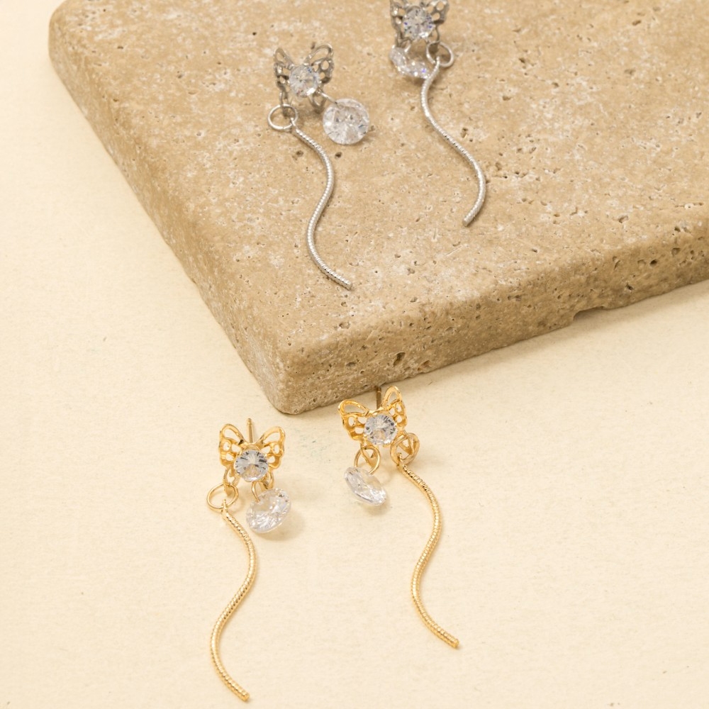 • The perfect way to showcase your unique style, this pair of dangle earrings encompasses a grand cz butterfly stud chain design. Master the art of accessorizing with this versatile pair of dangle earrings, a key element for achieving a chic and polished look. Available in G, S. This item is sold in packs of 1.