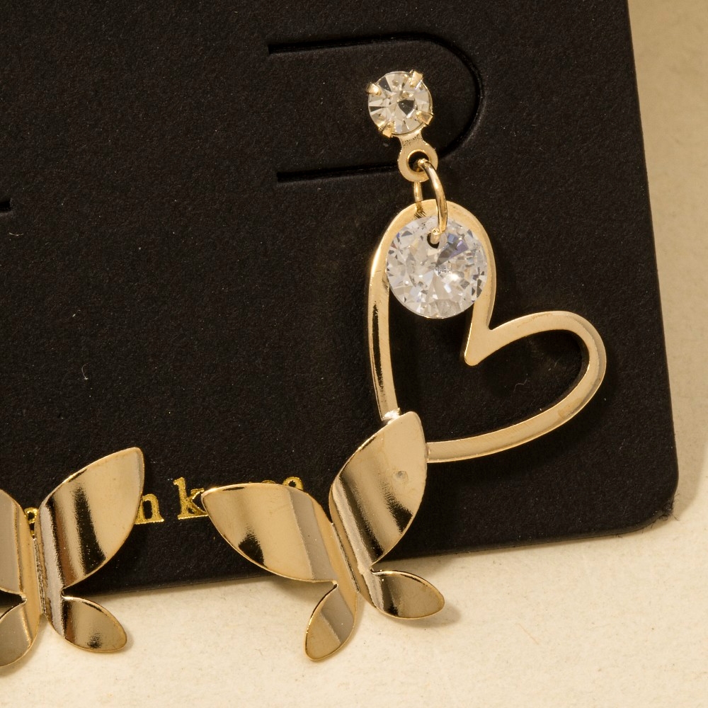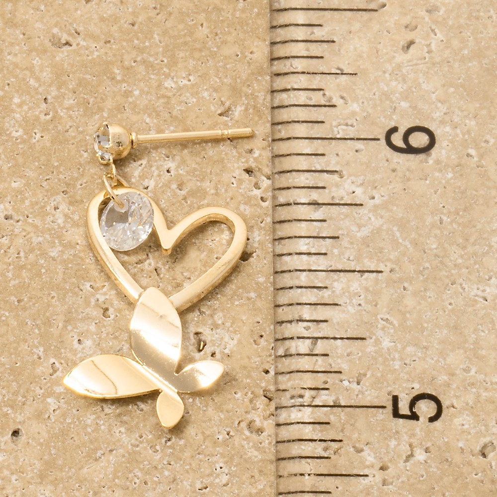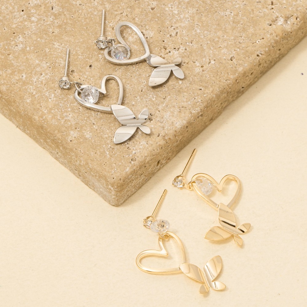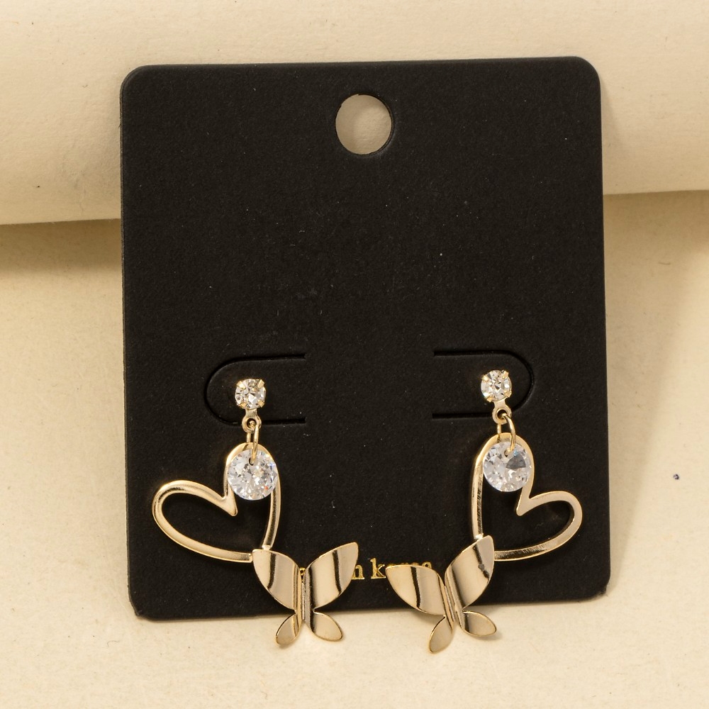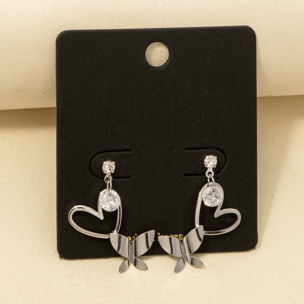- A piece that will never go out of style, this pair of drop earrings introduces an exceptional cz heart cutout butterfly design. Discover a new level of fashion versatility as this pair of drop earrings effortlessly elevates the allure of your attire. Available in G, S. This item is sold in packs of 1.