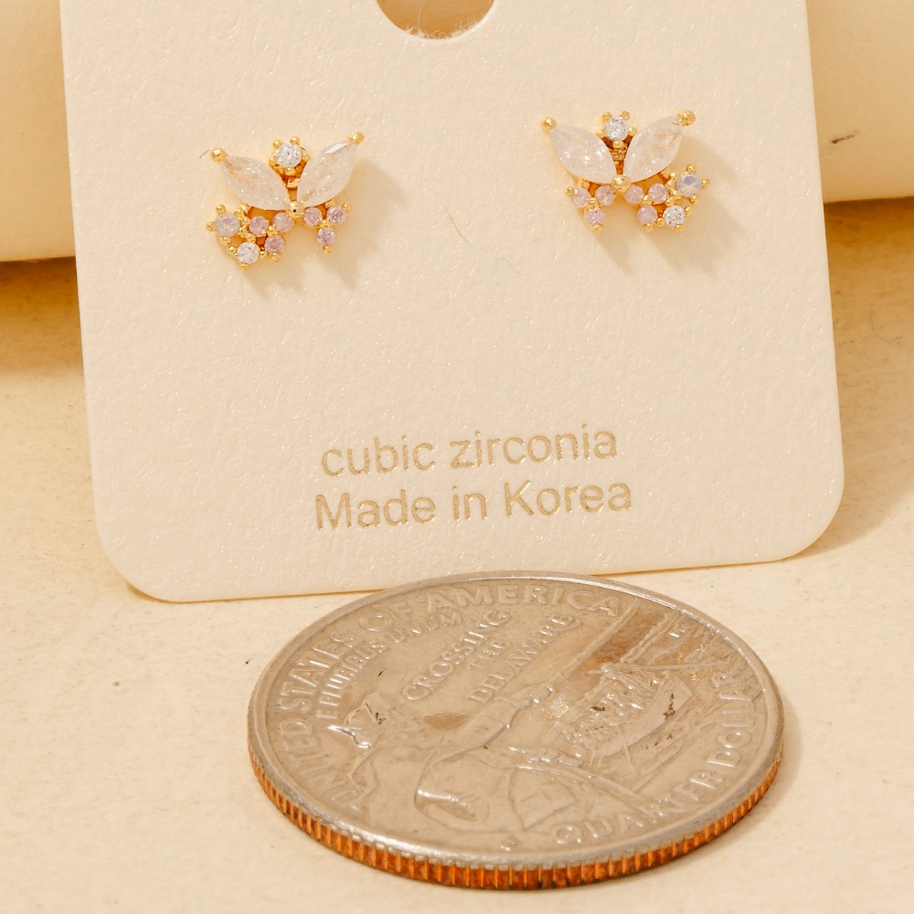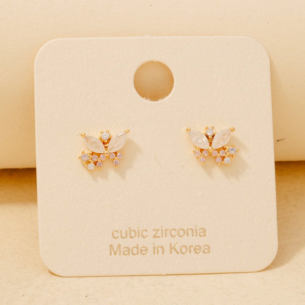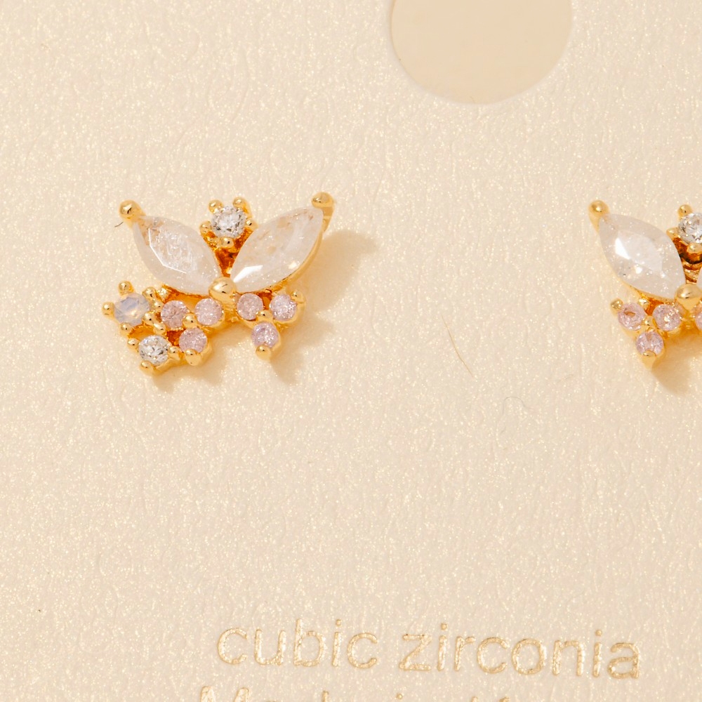 - A must-have addition to any pair of stud earrings collection, this pair of stud earrings flaunts a luxurious gold dipped cubic zirconia cluster butterfly design. Discover a new level of fashion versatility as this pair of stud earrings effortlessly elevates the allure of your attire. Available in G. This item is sold in packs of 1.