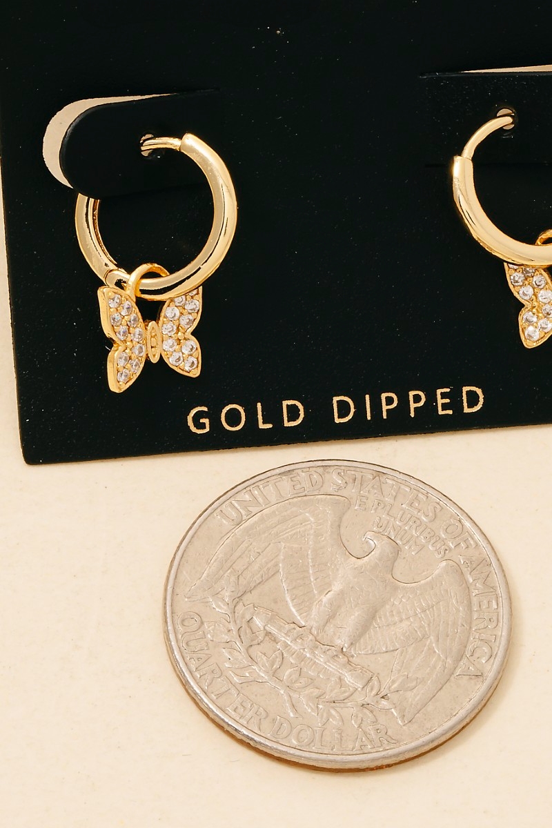• this pair of columbus jewelry hoop earrings features a fashionable gold dipped cubic zirconia pave butterfly charm style. Indulge in the artistry of accessorizing with this unique piece.