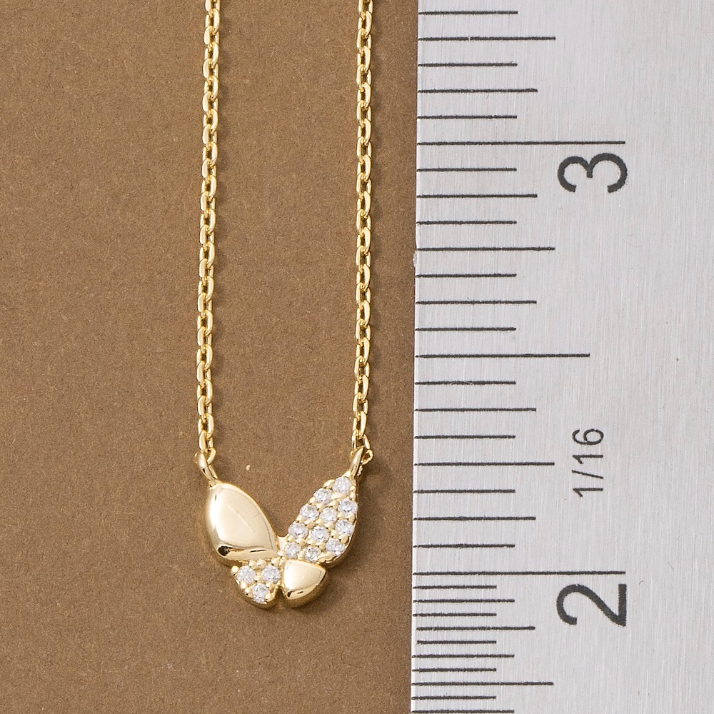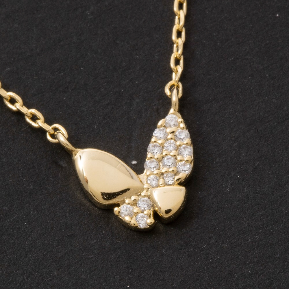 This piece is a true showstopper, this pendant necklace features a distinct gold dipped pave cubic zirconia butterfly design. Perfect for adding a touch of glamour and sophistication to any outfit, this pendant necklace is a must-have. This item is sold in packs of 12.