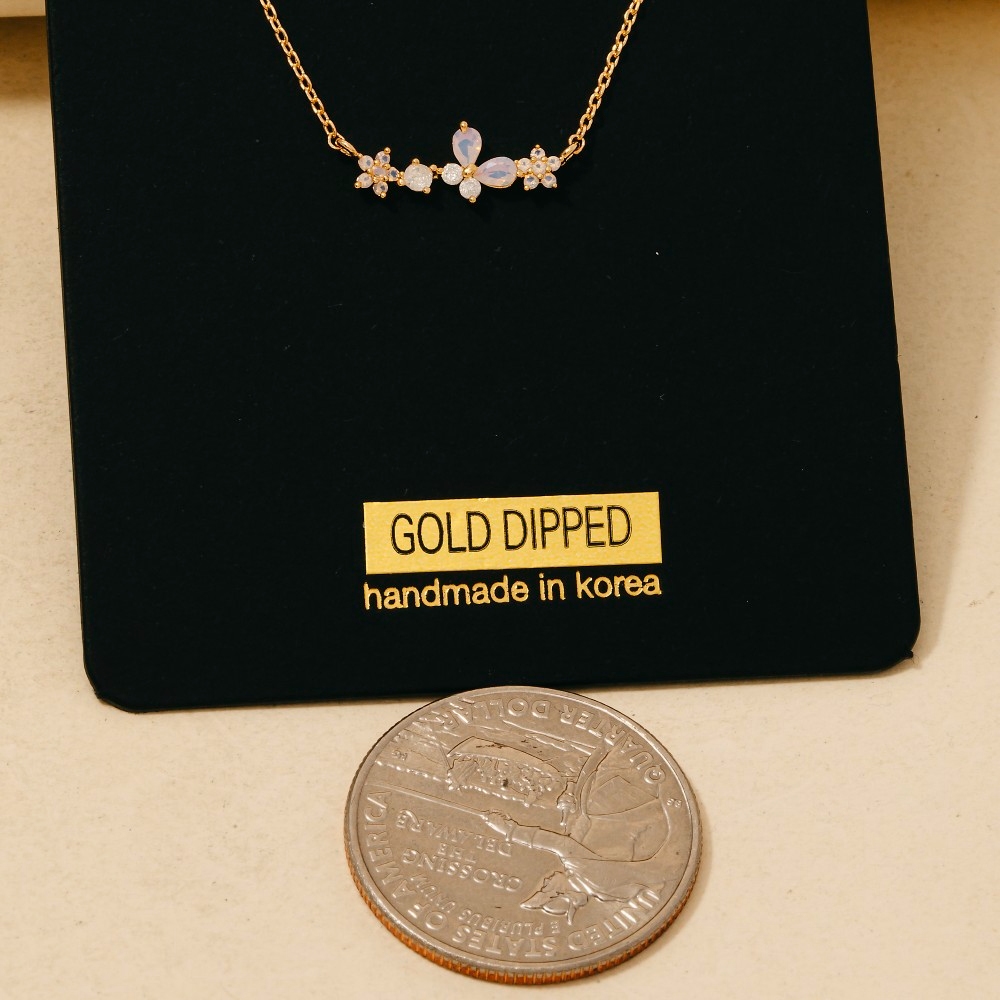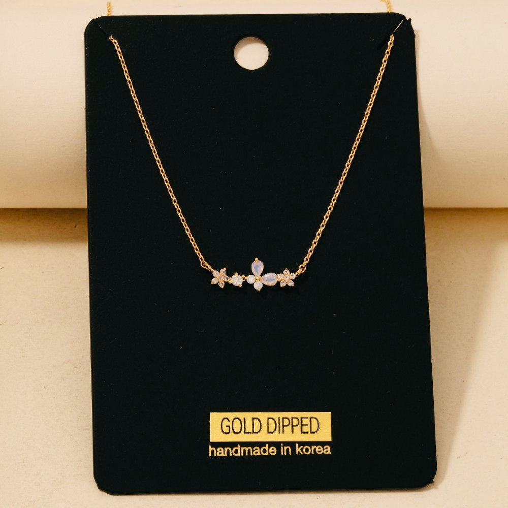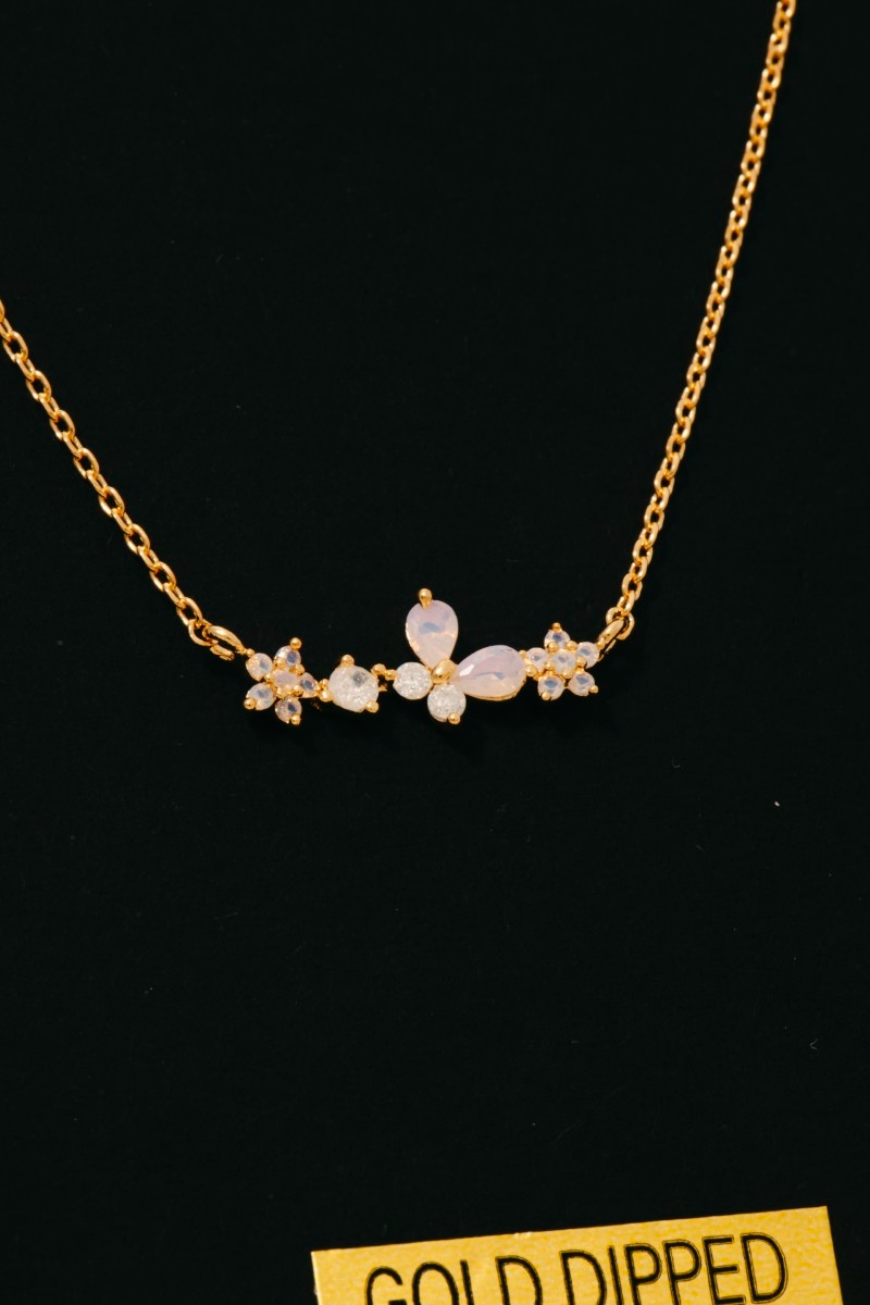 - A classic design with a modern twist, this necklace showcases an alluring gold dipped cubic zirconia floral butterfly bar pendant design. This necklace is ideal for both casual and formal events, adding a touch of sophistication to any outfit. Available in G. This item is sold in packs of 1.