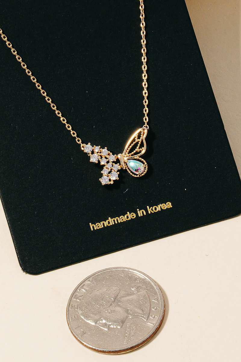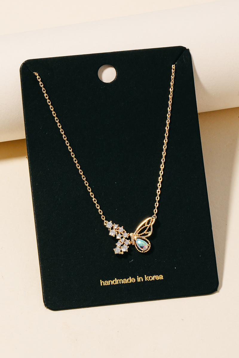 - This necklace introduces a stunning rhinestone and iridescent studded butterfly pendant style. Discover the perfect balance of subtlety and flair as this necklace effortlessly completes your look.