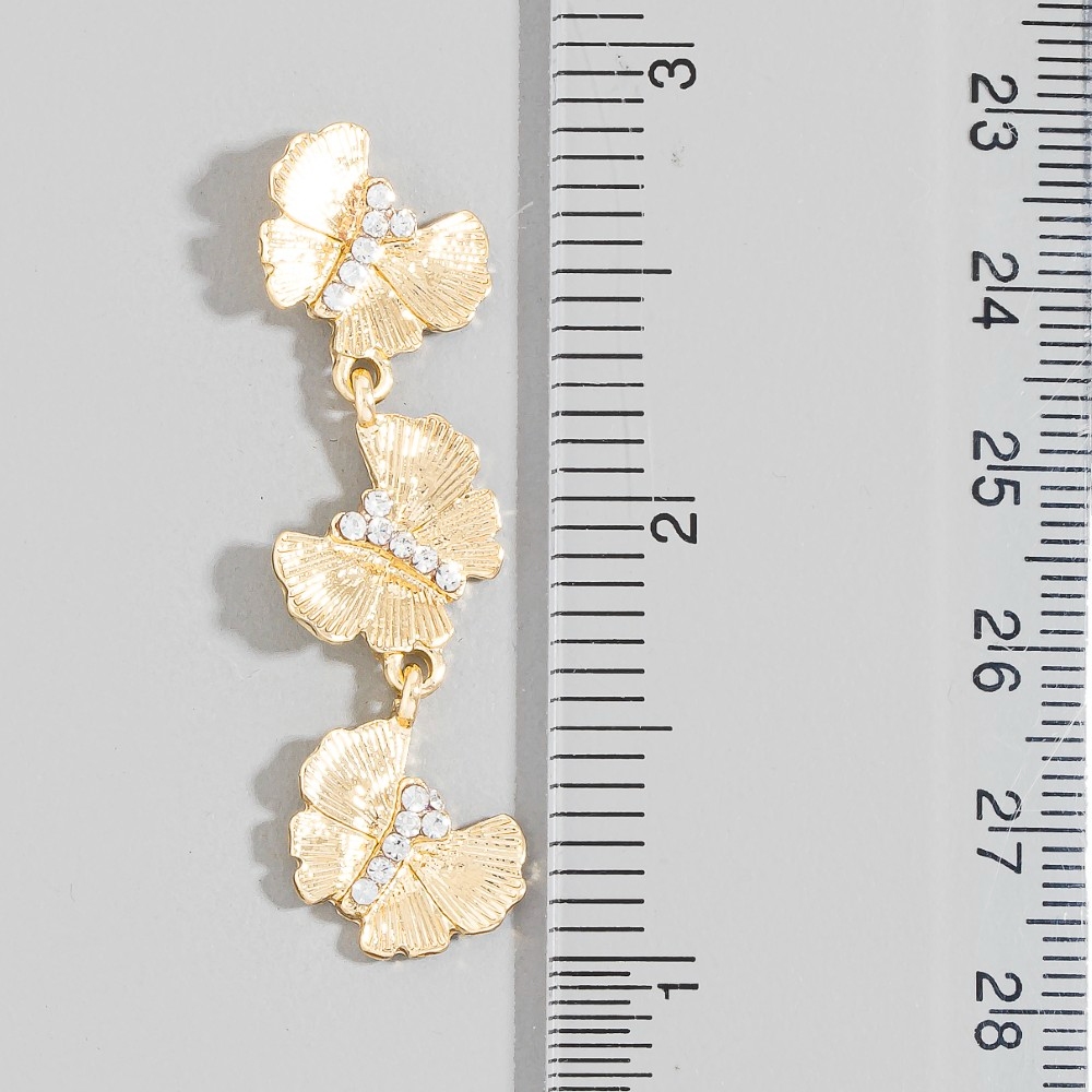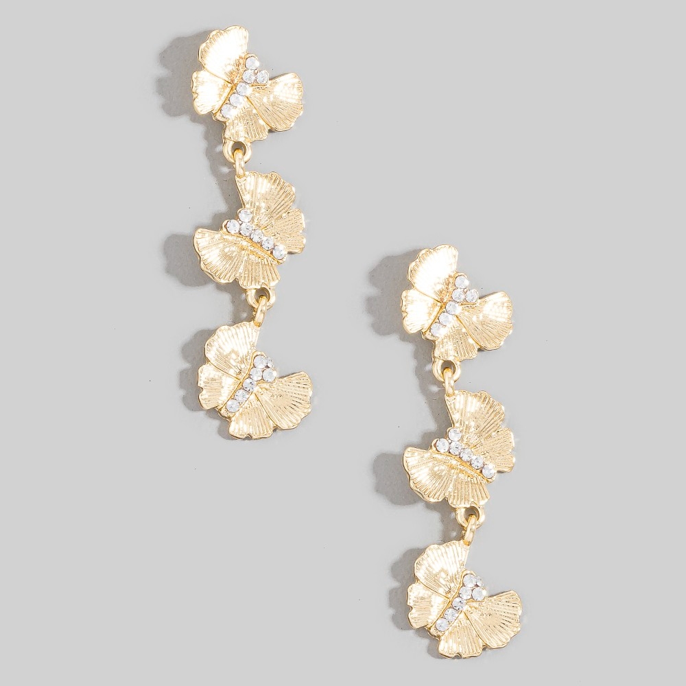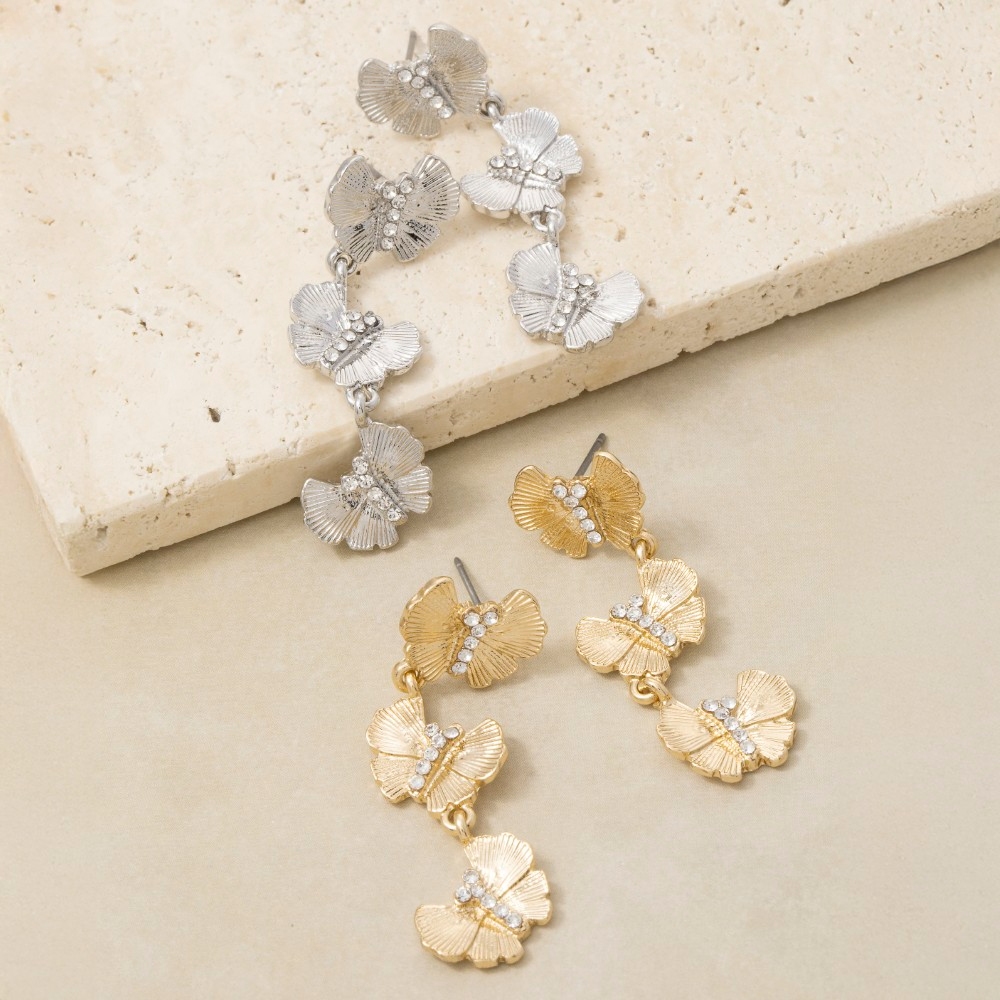 - This season's hottest pair of dangle earrings, this pair of dangle earrings features a distinct pave triple butterfly chain design. This item is perfect for anyone who loves to accessorize and add some personality to their outfits. Available in G, S. This item is sold in packs of 1.