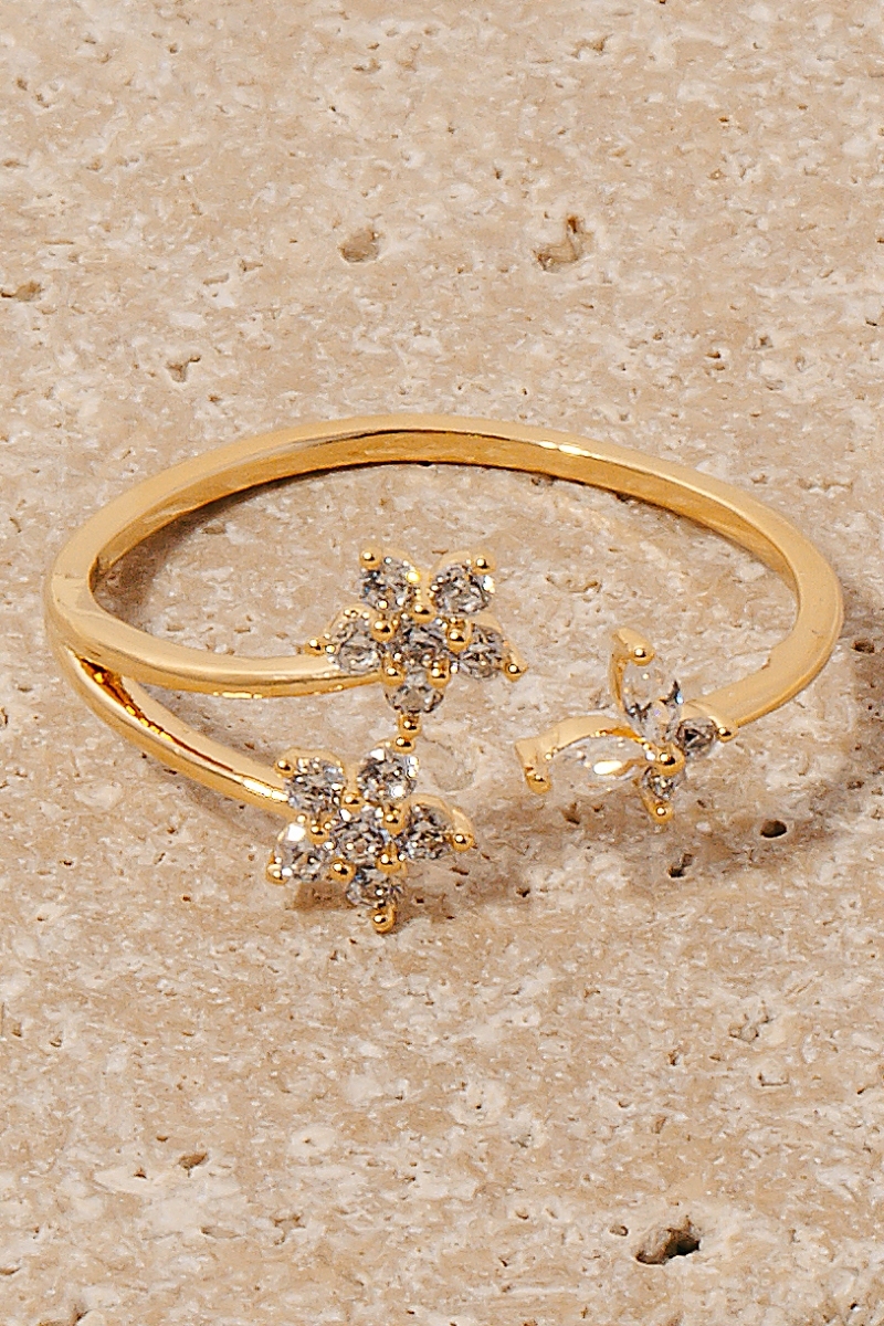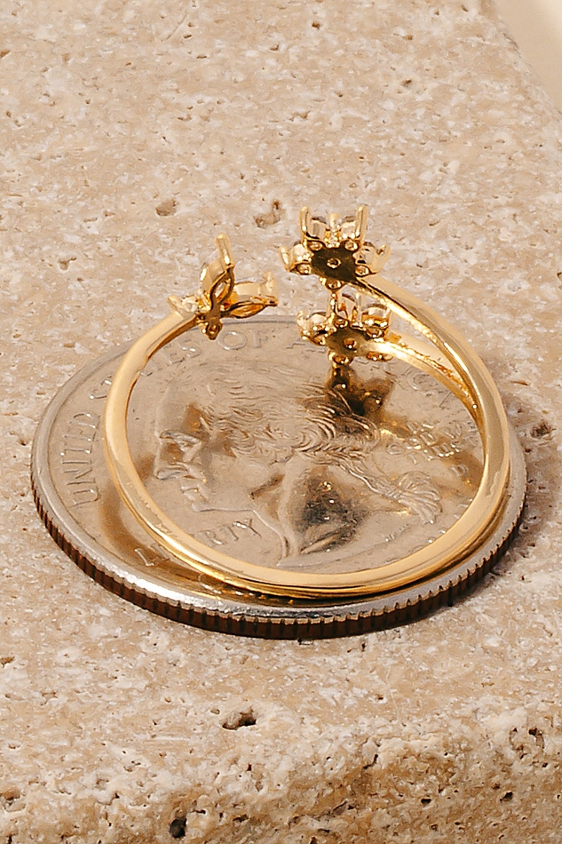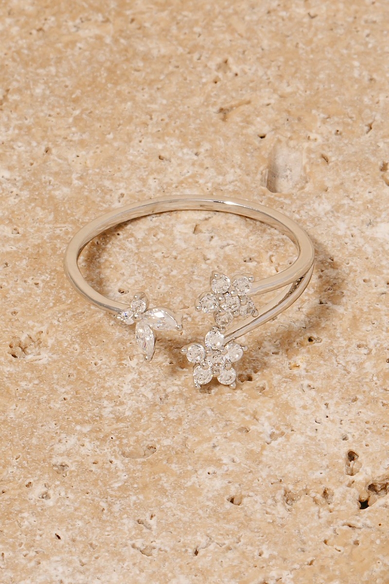 • This ring brings a luxurious double cubic zirconia flower and butterfly open band style. Celebrate the art of accessorizing with this piece that effortlessly encapsulates modern trends.