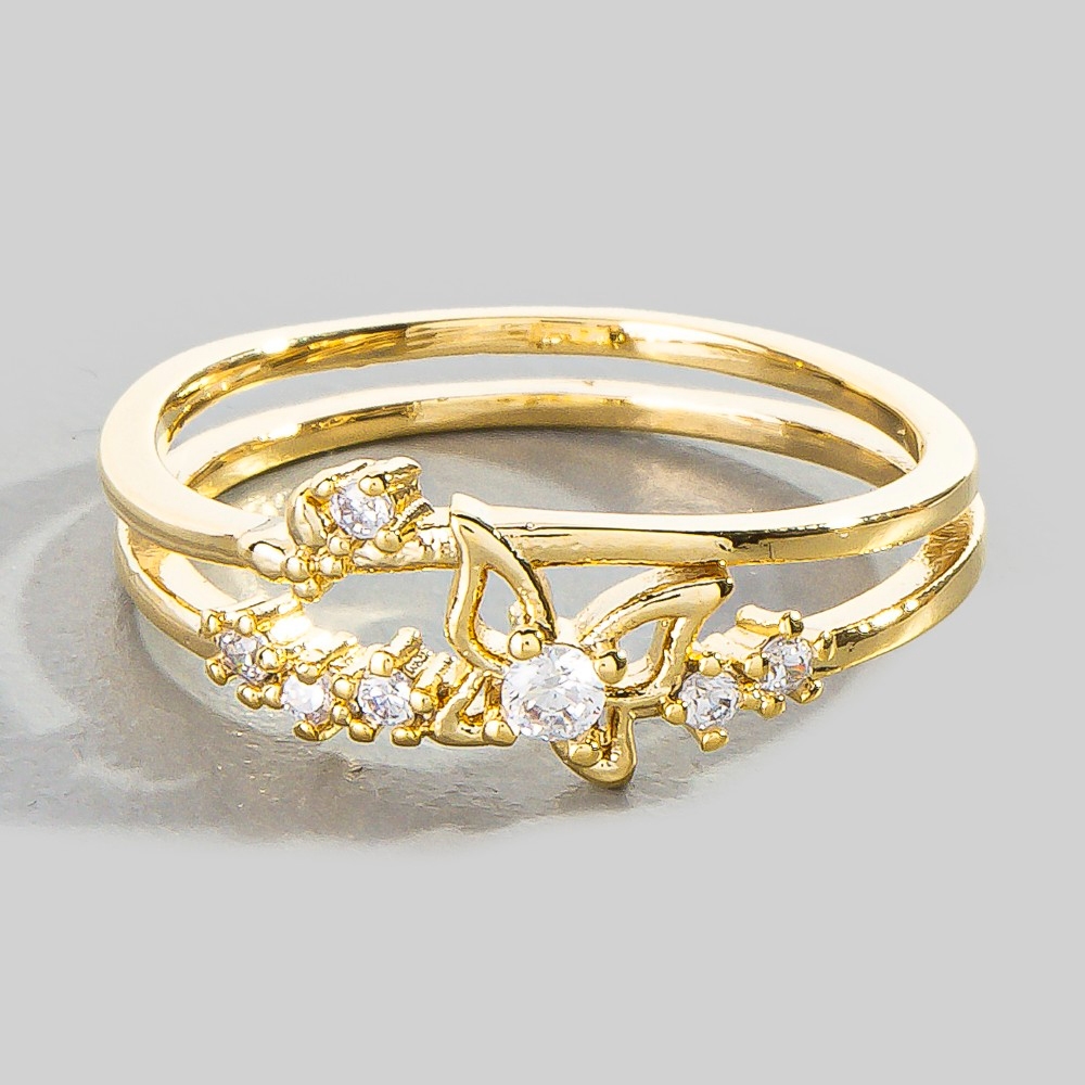 • A bold and daring choice, perfect for those who want to stand out from the crowd, this ring encompasses a grand gold dipped double row cubic zirconia butterfly design. Perfect for adding some texture and dimension to any outfit, this ring is a must-have. Available in G, S. This item is sold in packs of 1.